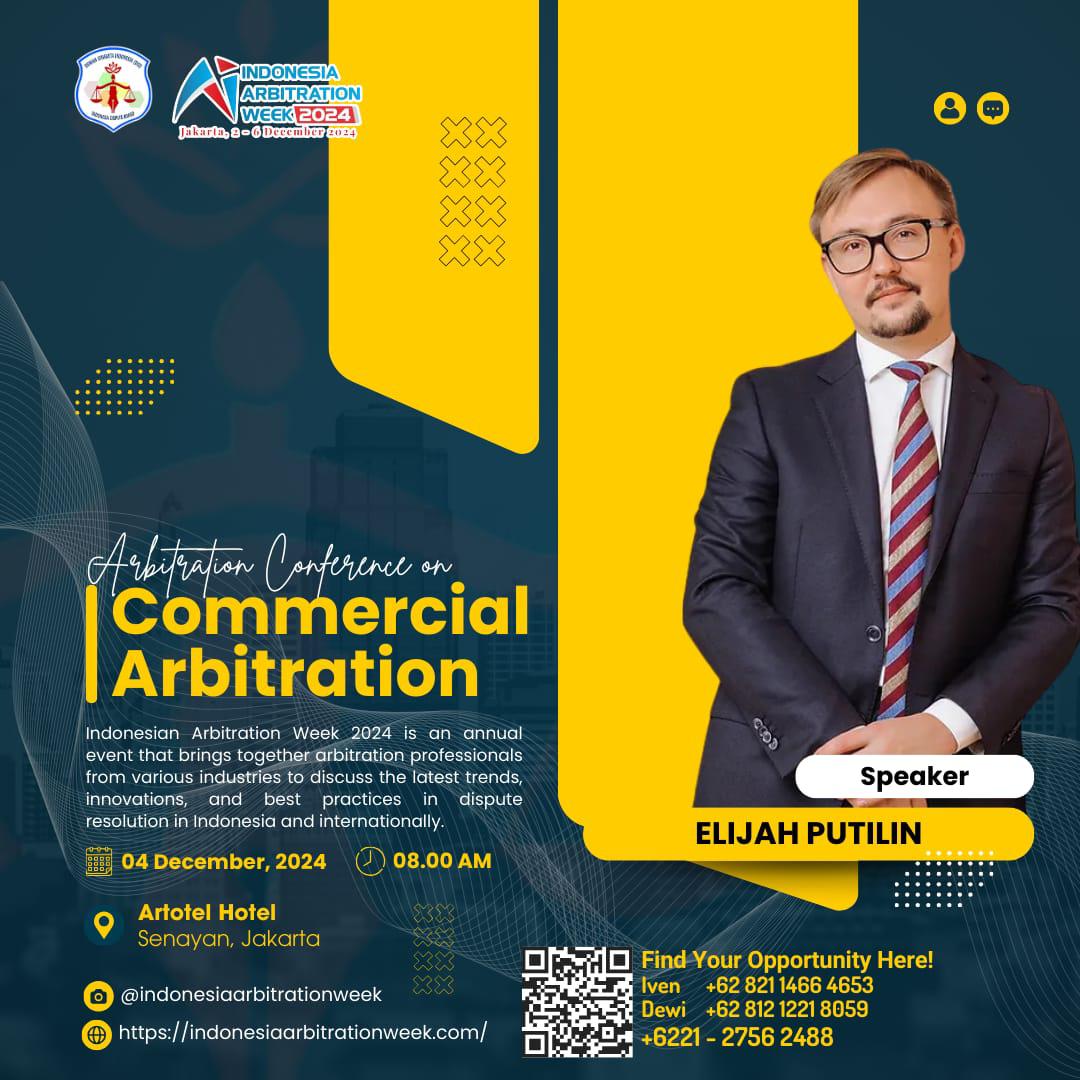 - Elijah Putilin – Seorang ahli dalam bidang arbitrase komersial, Elijah Putilin akan membahas pentingnya arbitrase dalam mendukung keberlanjutan bisnis dan membangun hubungan bisnis yang sehat. Dengan pengalaman luasnya, Elijah akan membagikan perspektif tentang cara menyelesaikan perselisihan komersial dengan pendekatan yang transparan, cepat, dan menguntungkan kedua belah pihak.