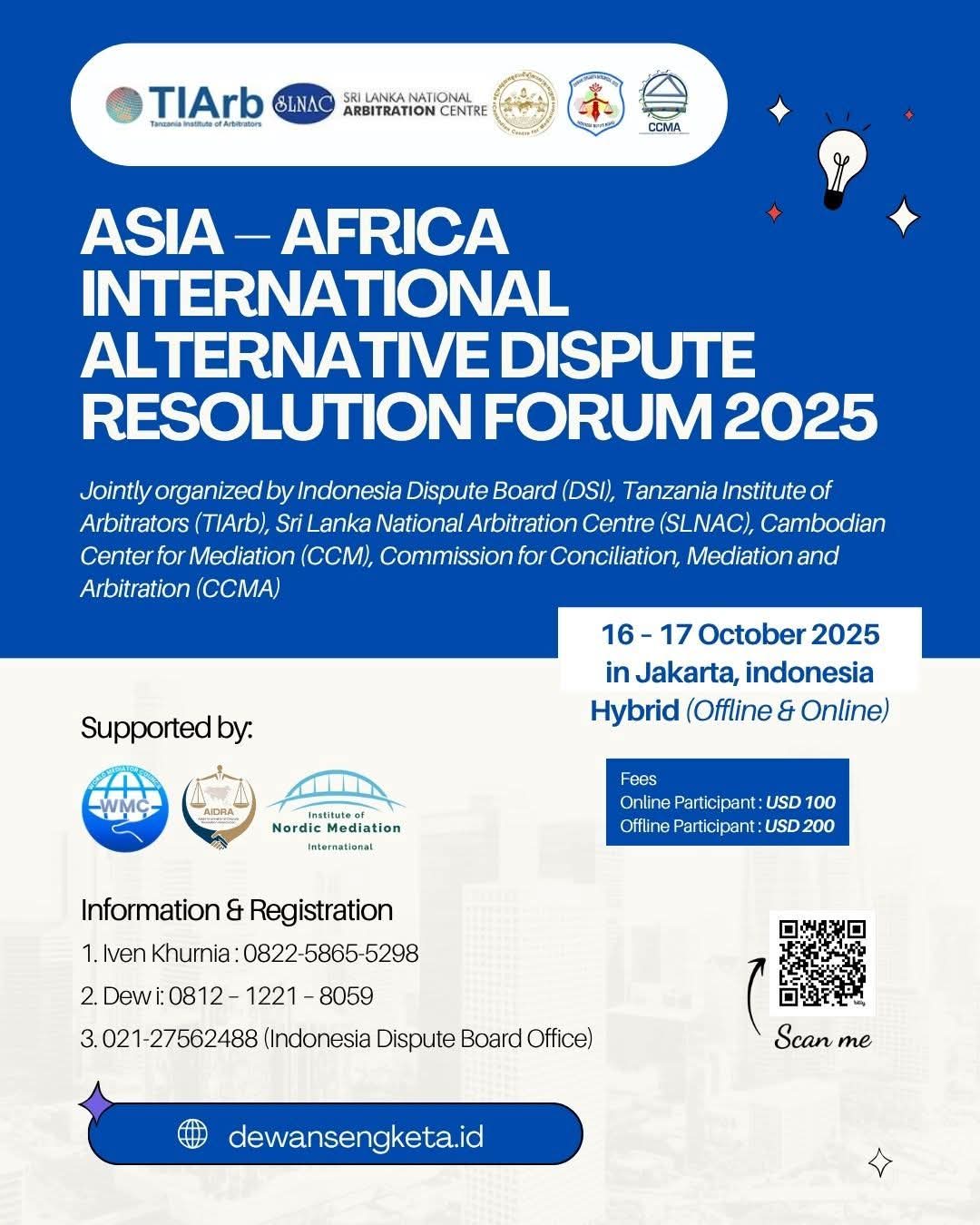 Jakarta, Indonesia β€” Dunia penyelesaian sengketa alternatif akan kembali diramaikan dengan kehadiran Asia – Africa International Alternative Dispute Resolution Forum 2025, yang akan diselenggarakan pada:
