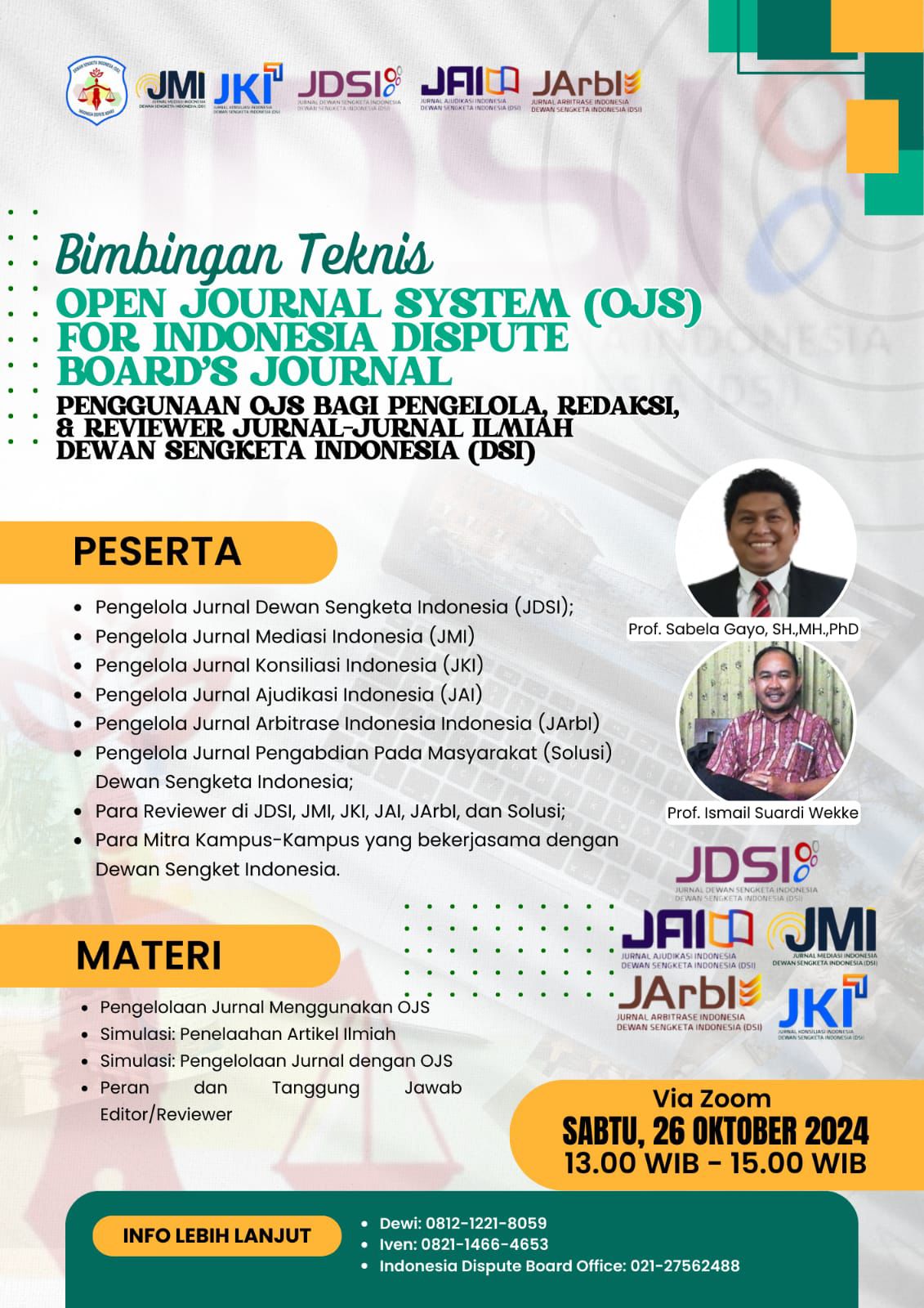 Kami mengundang seluruh pengelola, redaksi, dan reviewer jurnal ilmiah Dewan Sengketa Indonesia (DSI) untuk berpartisipasi dalam kegiatan Bimbingan Teknis Open Journal System (OJS) yang akan membahas cara penggunaan dan pengelolaan OJS secara efektif.
