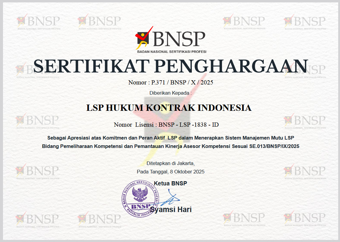 Badan Nasional Sertifikasi Profesi (BNSP) resmi menganugerahkan Sertifikat Penghargaan kepada Lembaga Sertifikasi Profesi Hukum Kontrak Indonesia (LSP HKI) sebagai bentuk apresiasi atas kinerja lembaga tersebut dalam menjaga dan memelihara Sistem Manajemen Mutu LSP.