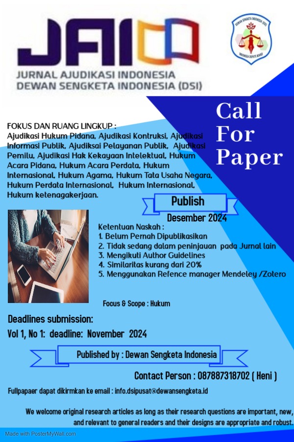 Jurnal Ajudikasi Indonesia merupakan media ilmiah yang bertujuan untuk menyebarluaskan hasil karya, ide, dan inovasi dalam bidang penyelesaian sengketa, ajudikasi, serta pengabdian kepada masyarakat. Dengan fokus pada pendekatan teoritis dan praktis, jurnal ini hadir sebagai wadah untuk memperkaya wawasan hukum dan pengembangan penyelesaian sengketa di Indonesia.