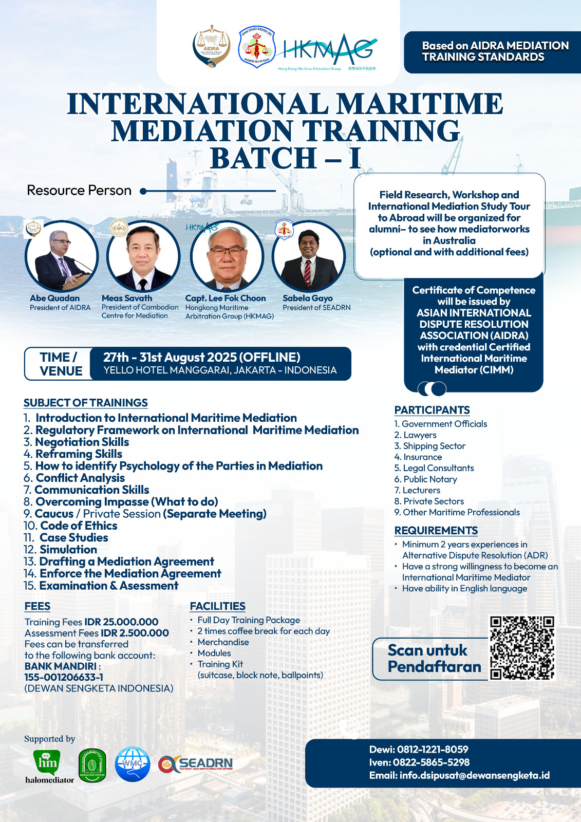 Segera daftarkan diri Anda untuk mengikuti pelatihan mediasi maritim internasional yang diselenggarakan secara offline menggunakan bahasa Inggris. Pelatihan ini dirancang untuk memberikan keterampilan dalam menyelesaikan sengketa di sektor maritim secara internasional.