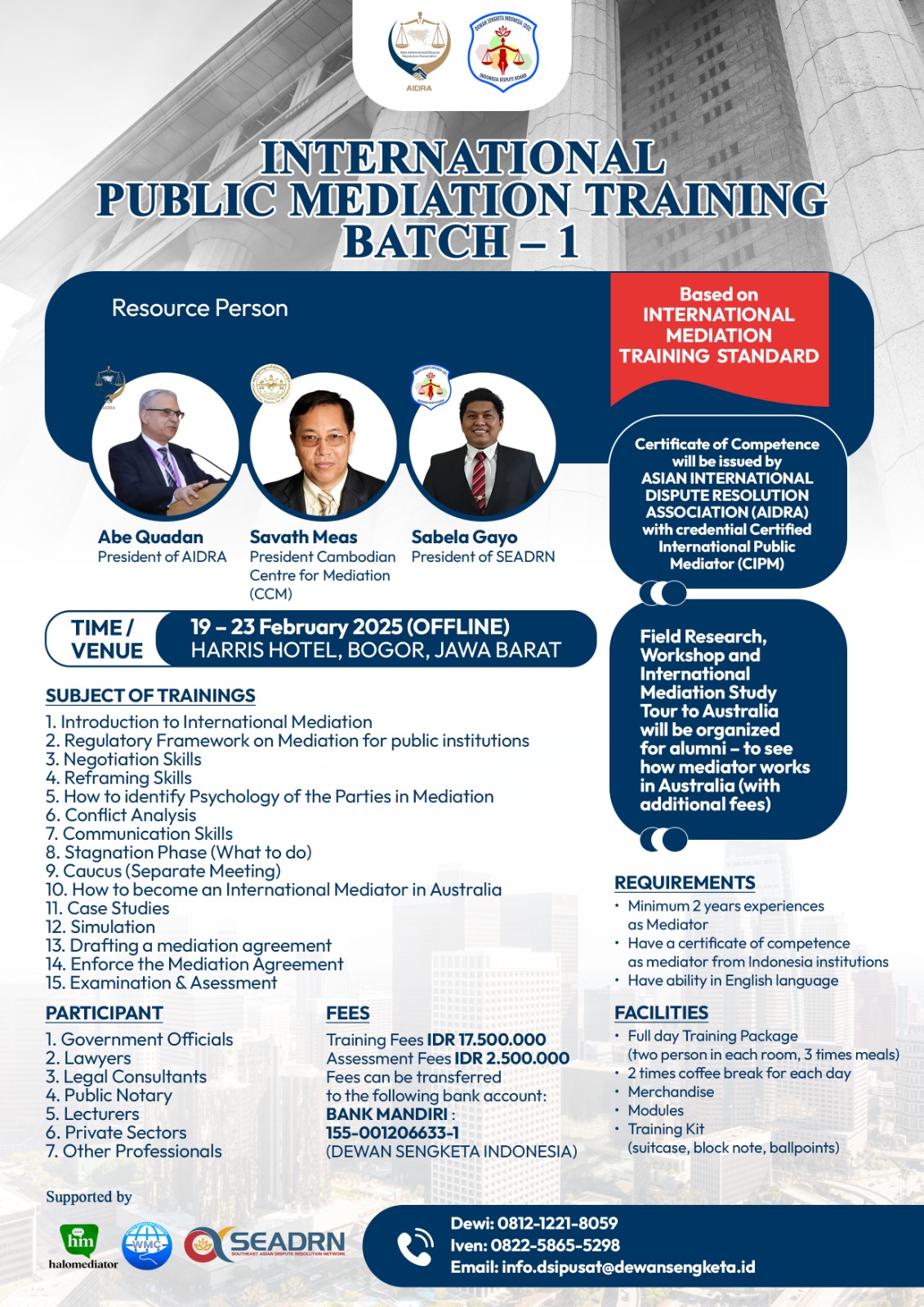 - Sertifikasi Credential Certified International Public Mediator (CIPM).