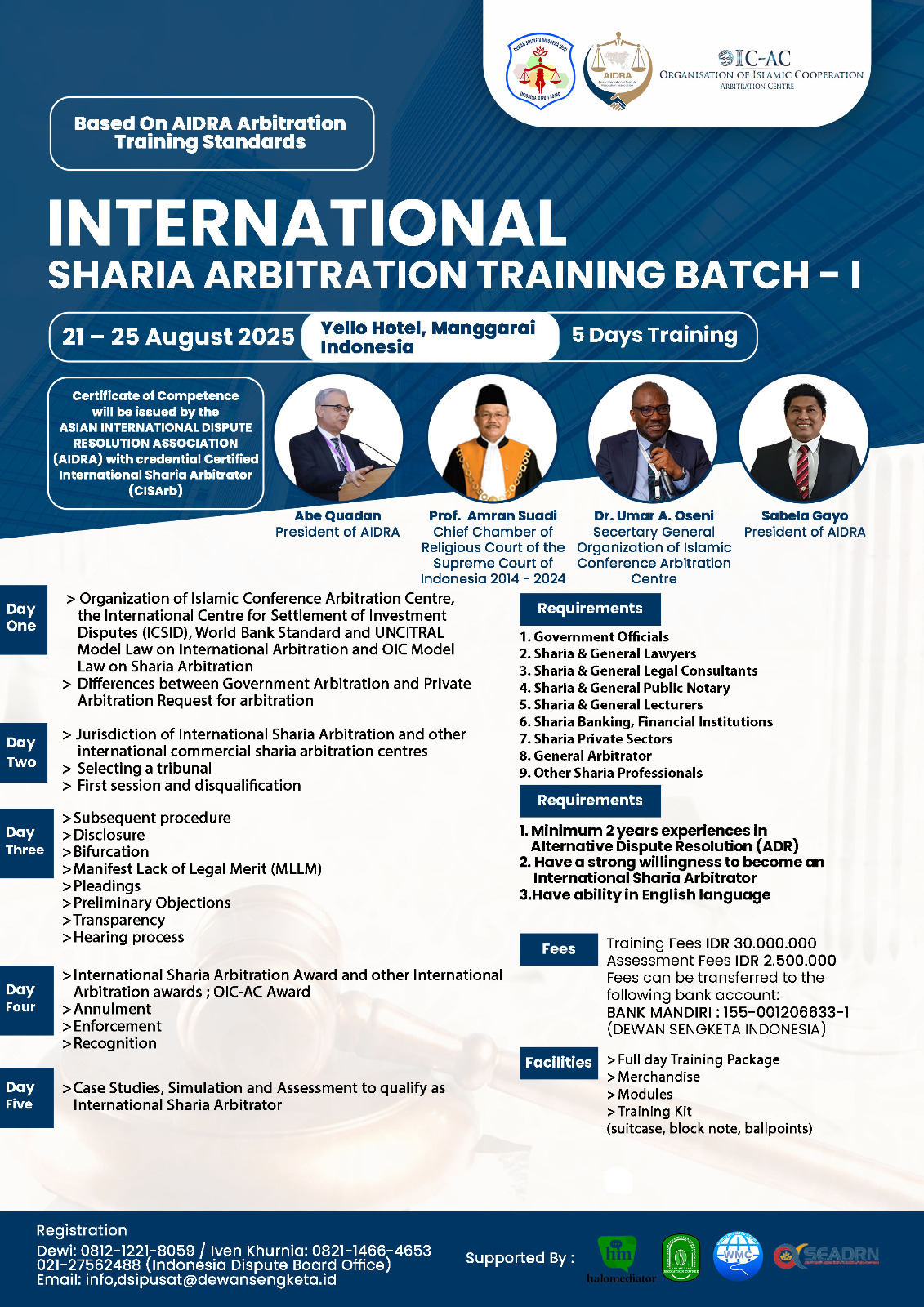 Segera daftarkan diri Anda untuk mengikuti pelatihan offline mengenai arbitrase syariah internasional, yang diselenggarakan dalam bahasa Inggris. Pelatihan ini memberikan kesempatan untuk memperoleh sertifikat sebagai Certified International Sharia Arbitrator (CISArb).