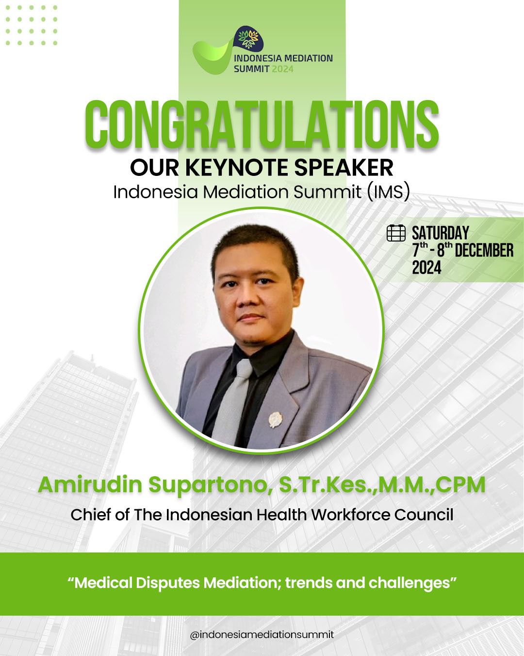 CONGRATULATIONS OUR KEYNOTE SPEAKER Indonesia Mediation Summit ( IMSwp-graceSeptember 30, 2024MEDIATOR INTERNATIONAL Amirudin Supartono, S. Tr. Kes., M.M., CPM ( Chief of The Indonesian Health Workforce Council ) 🗓️: Saturday 7th – 8th December 2024