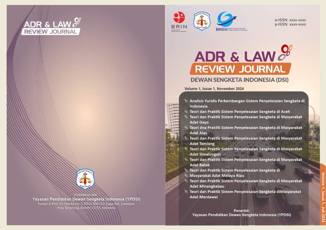 The ADR & LAW REVIEW JOURNAL by Dewan Sengketa Indonesia (DSI) presents its inaugural issue with a deep dive into various aspects of dispute resolution systems across Indonesia. This volume explores the evolution of dispute resolution in the country, with a focus on different indigenous communities’ practices and legal theories. The journal’s contributors provide insightful perspectives on the development and challenges of resolving conflicts in both formal and traditional settings. Below are the featured articles in this first edition: