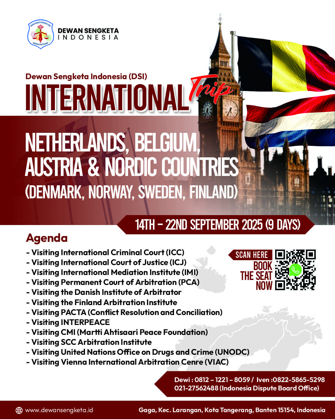 Jakarta, Indonesia – Dewan Sengketa Indonesia (DSI) mengumumkan daftar peserta yang terdaftar untuk mengikuti International Trip pada 14 – 22 September 2025 ke Belanda, Belgia, Austria, dan negara-negara Nordik (Denmark, Norway, Sweden, Finland). Para peserta akan mengunjungi berbagai lembaga internasional yang berfokus pada penyelesaian sengketa dan hukum internasional.