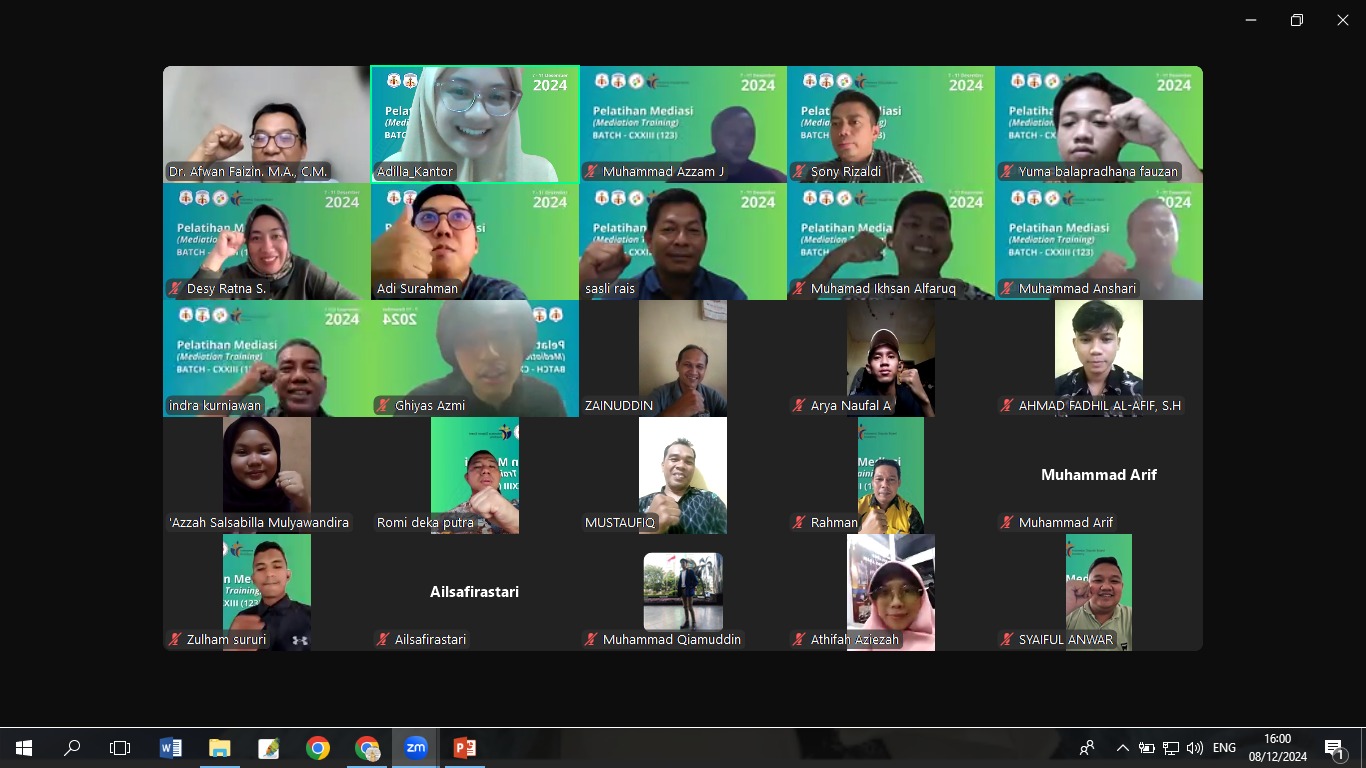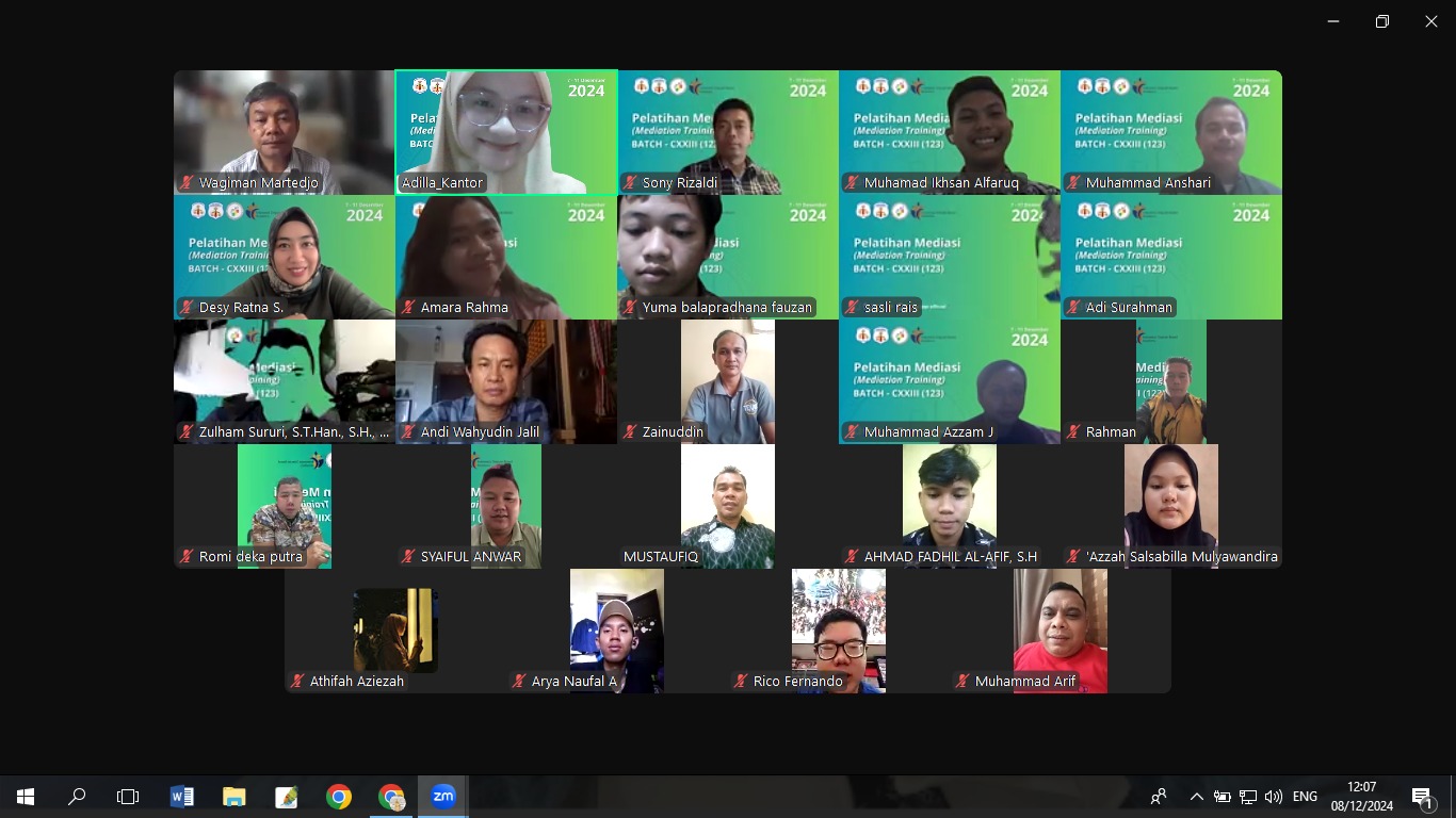 Minggu, 8 Desember 2024 – Pelatihan Mediasi Batch 123 kembali berlanjut pada hari kedua dengan suasana yang produktif dan interaktif melalui platform Zoom. Pelatihan yang berlangsung dari tanggal 7 hingga 11 Desember 2024 ini semakin menarik dengan kehadiran dua narasumber ahli di bidang mediasi.