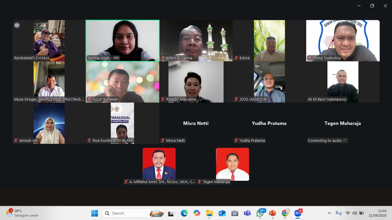 Pelatihan Kepatuhan Hukum yang berlangsung secara daring melalui Zoom sejak 9 September 2025, kini memasuki hari ketiga pada Kamis (11/9).