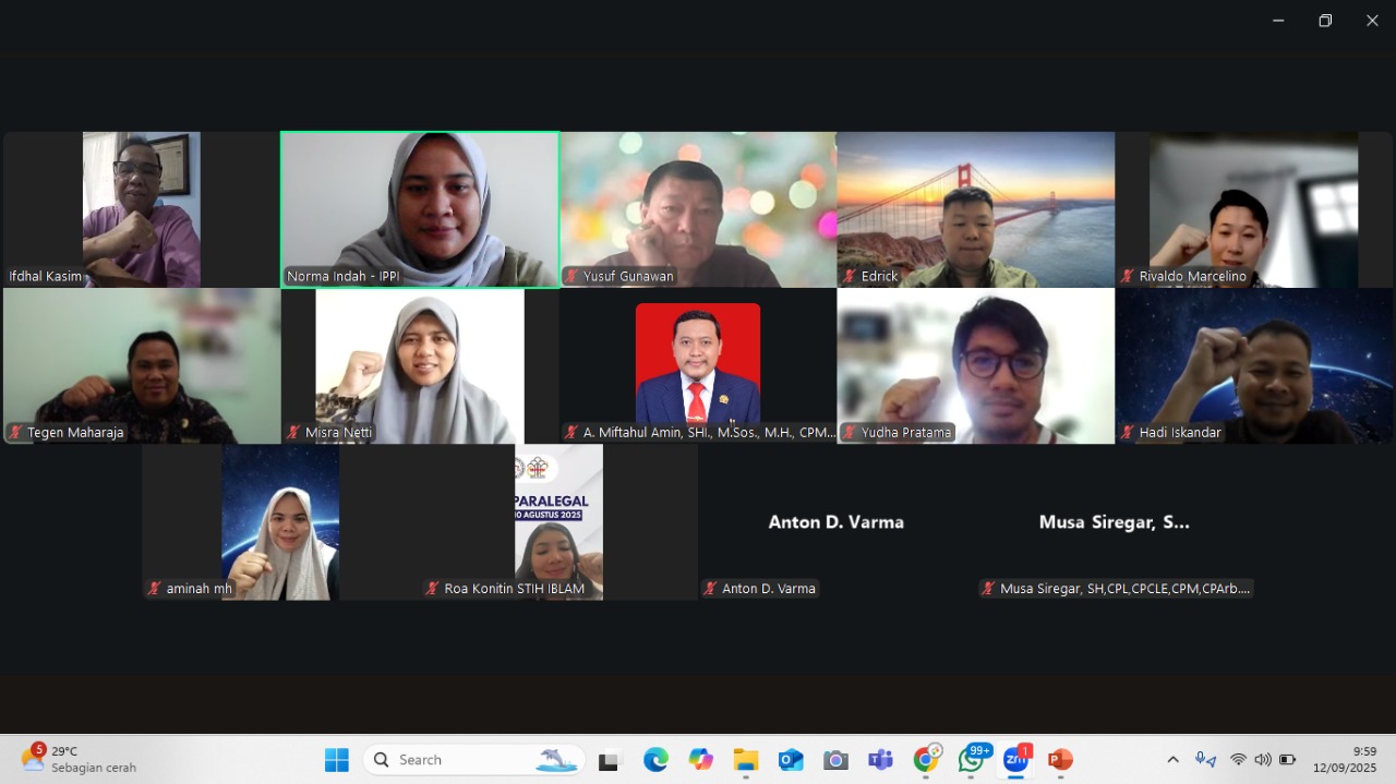 Institut Pengadaan Publik Indonesia (IPPI) bekerja sama dengan Dewan Sengketa Indonesia (DSI), Yayasan Pendidikan Dewan Sengketa Indonesia, dan Perkumpulan Profesi Hukum Perikatan Indonesia (PAHPI) sukses menyelenggarakan Hari Keempat (Day 4) Pelatihan Kepatuhan Hukum yang berlangsung pada Jumat, 12 September 2025 melalui platform Zoom Meeting.