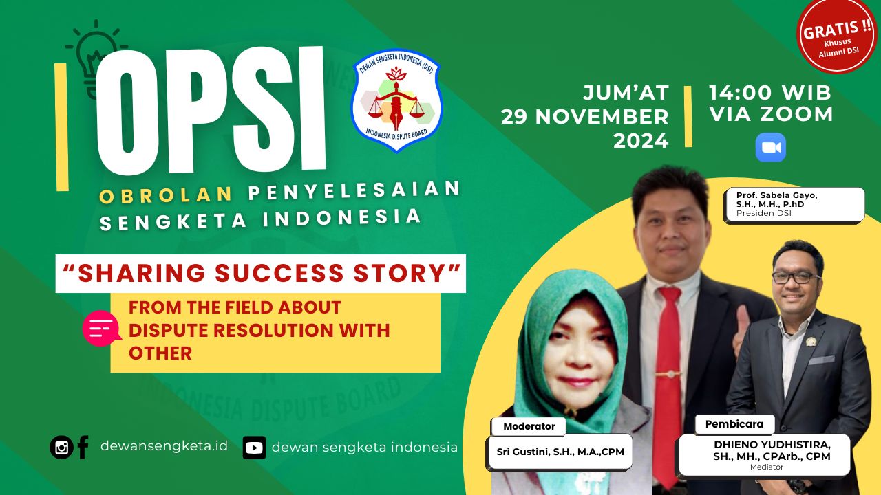 Jakarta, 29 November 2024 – Dewan Sengketa Indonesia (DSI) kembali menghadirkan program menarik melalui kegiatan OPSI (Obrolan Penyelesaian Sengketa Indonesia) Sharing Success Story. Acara ini dirancang sebagai wadah berbagi pengalaman sukses dalam menyelesaikan berbagai sengketa di Indonesia, dengan tujuan meningkatkan wawasan dan kompetensi para peserta di bidang mediasi dan arbitrase.