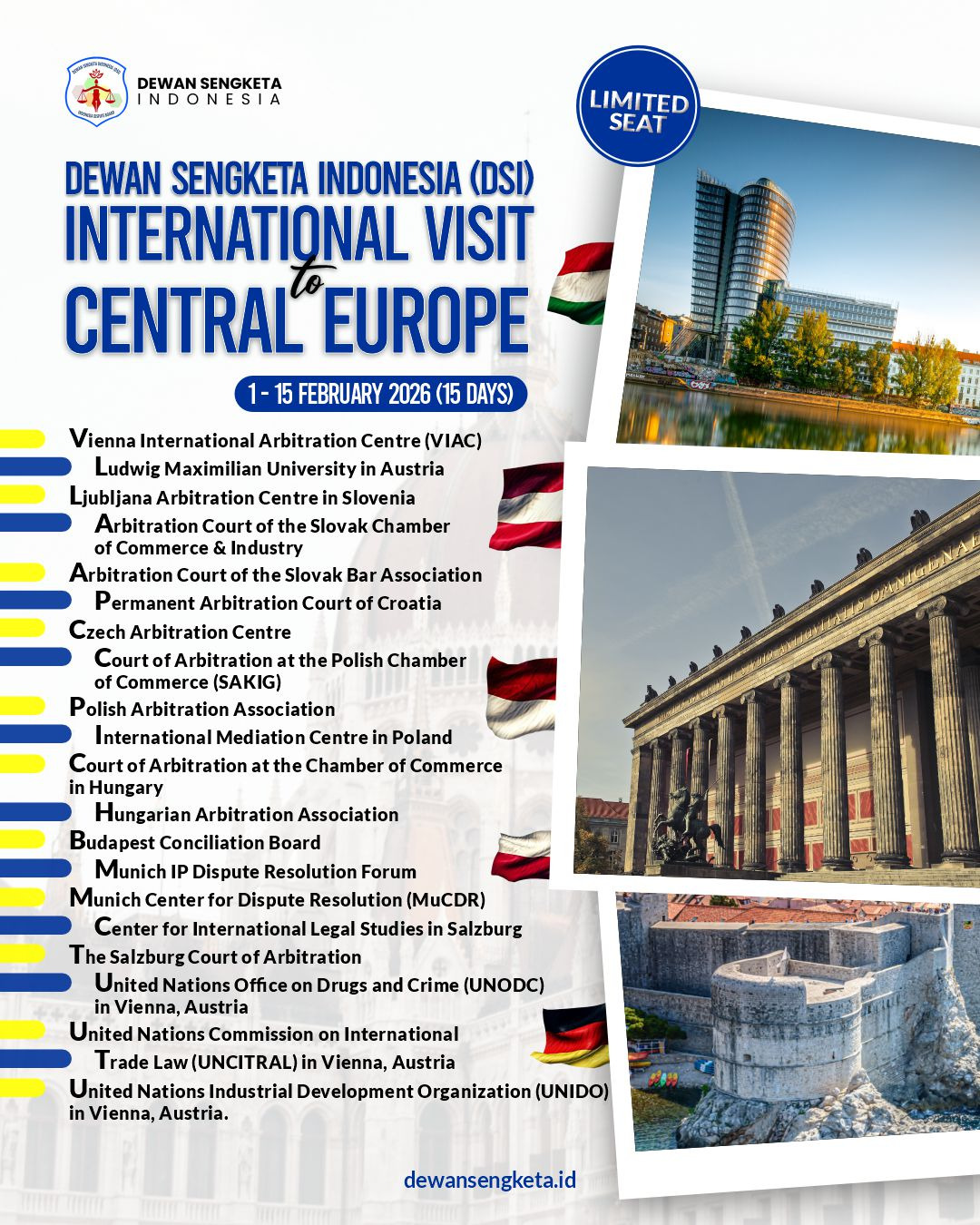 Jakarta – Dewan Sengketa Indonesia (DSI) kembali menghadirkan program unggulan bertaraf internasional bertajuk “International Visit to Central Europe” yang akan dilaksanakan pada 1 – 15 Februari 2026.