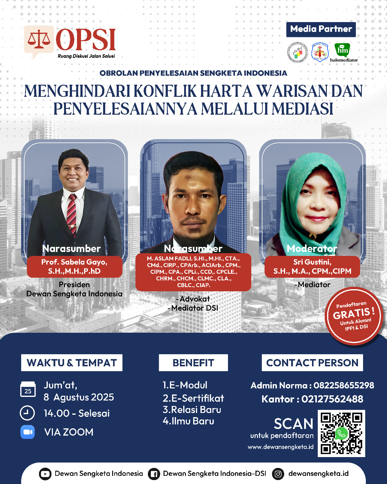 Jakarta, 8 Agustus 2025 — Dewan Sengketa Indonesia (DSI) kembali menyelenggarakan kegiatan OPSI (Obrolan Penyelesaian Sengketa Indonesia) yang kali ini mengangkat topik penting: “Menghindari Konflik Harta Warisan dan Penyelesaiannya Melalui Mediasi.”