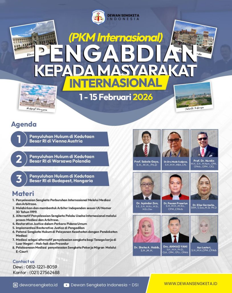 Dewan Sengketa Indonesia (DSI) kembali menyelenggarakanprogram Pengabdian kepada Masyarakat (PKM) Internasional yang akan berlangsung pada 1–15 Februari 2026. Kegiatan ini menjadi agenda rutin DSI untuk memperluas edukasi hukum dan penyelesaian sengketa kepada masyarakat Indonesia di luar negeri, khususnya diaspora yang tinggal di kawasan Eropa.