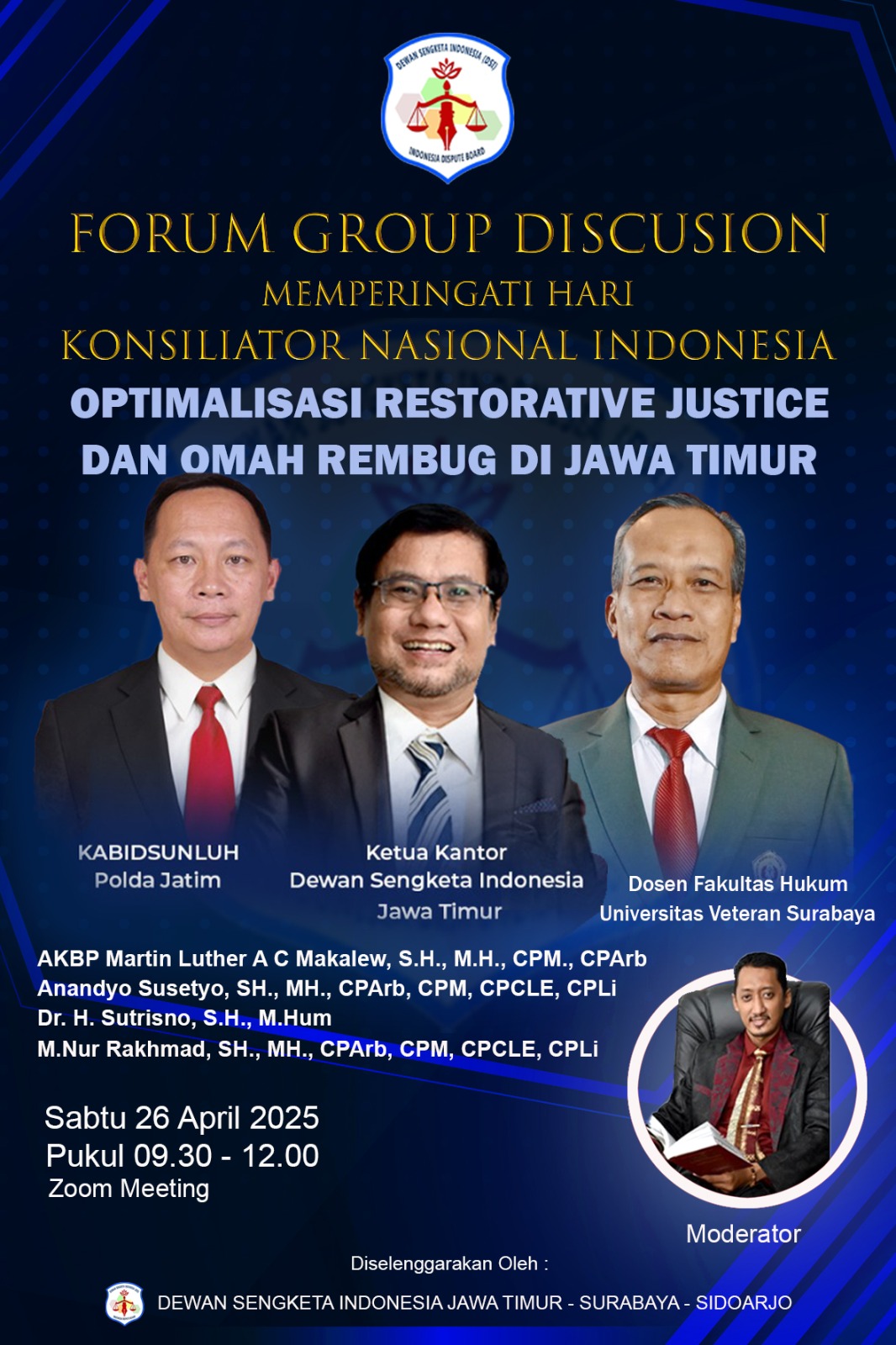 Dalam rangka memperingati Hari Konsiliator Nasional Indonesia, Dewan Sengketa Indonesia Jawa Timur – Surabaya – Sidoarjo menyelenggarakan acara Forum Group Discussion (FGD) bertema “Optimalisasi Restorative Justice dan Omah Rembug di Jawa Timur”. Acara ini akan digelar secara hybrid dan gratis untuk umum, memberikan kesempatan kepada masyarakat luas untuk berdiskusi langsung dengan para pakar di bidang mediasi dan penyelesaian sengketa.