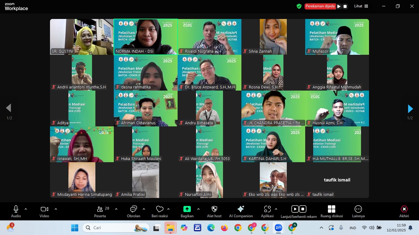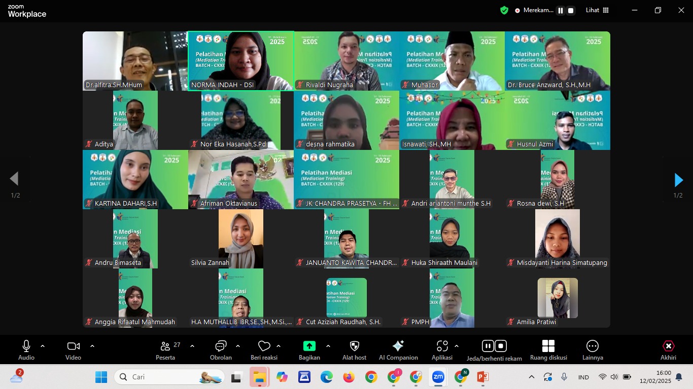 Pada hari Rabu, 12 Februari 2025, Pelatihan Mediasi Batch 129 memasuki hari kedua dengan semangat tinggi. Pelatihan yang dilaksanakan secara daring melalui Zoom ini berlangsung dari 11 hingga 16 Januari 2025, menghadirkan suasana belajar yang interaktif dan inspiratif.