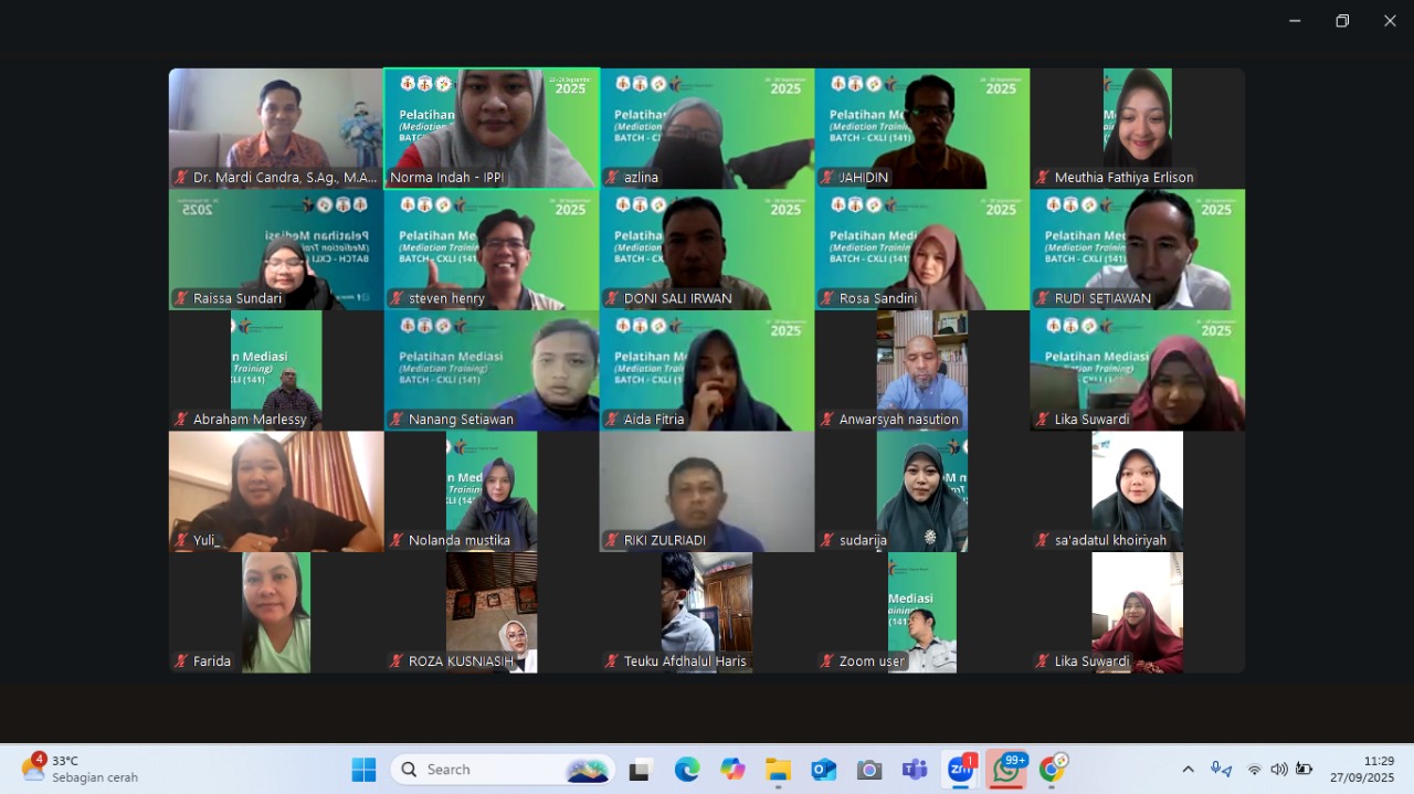 Jakarta – Hari kedua Pelatihan Mediasi Batch 141 kembali digelar pada Sabtu, 27 September 2025, secara daring melalui Zoom Meeting. Kegiatan yang berlangsung sejak 26 hingga 30 September 2025 ini menghadirkan narasumber utama, Bapak Dr. Mardi Candra, S.Ag., M.Ag., M.H., CPM, seorang Trainer TOT Mahkamah Agung Republik Indonesia.