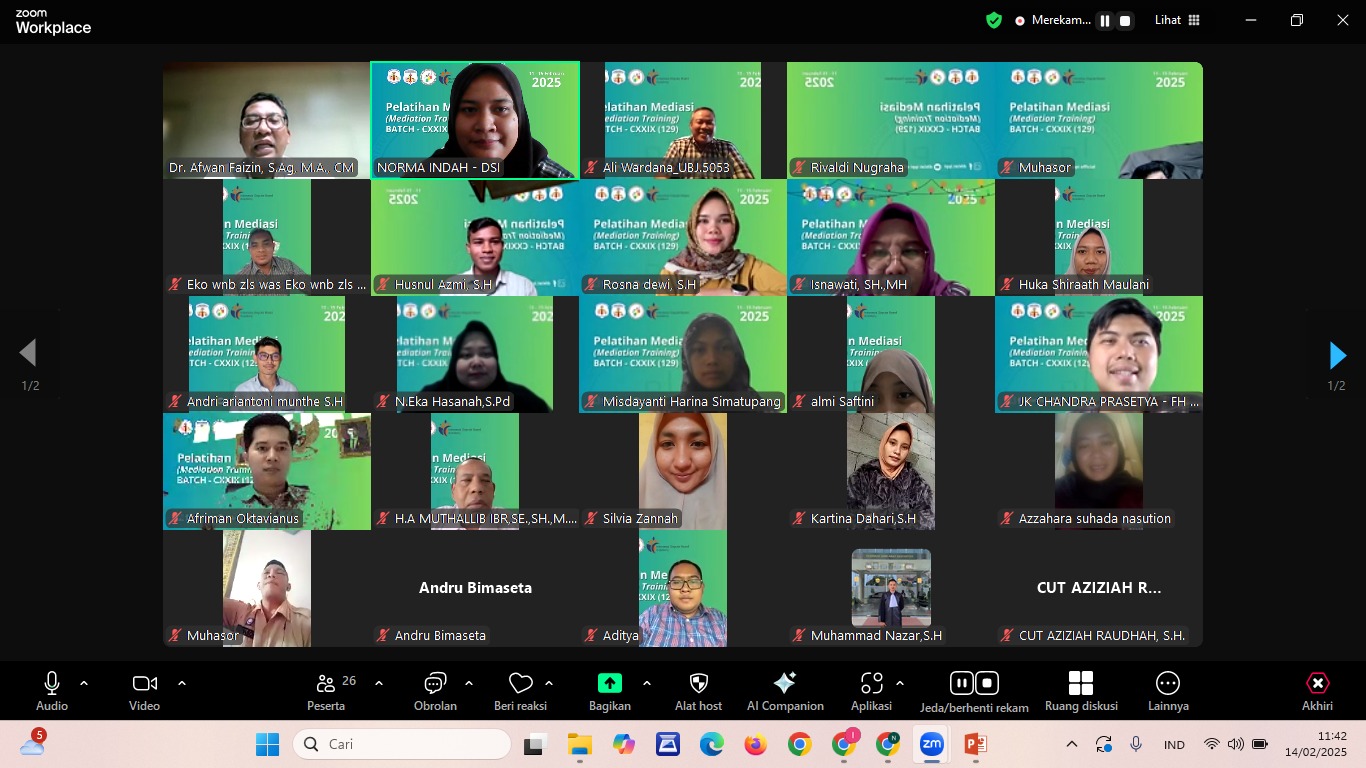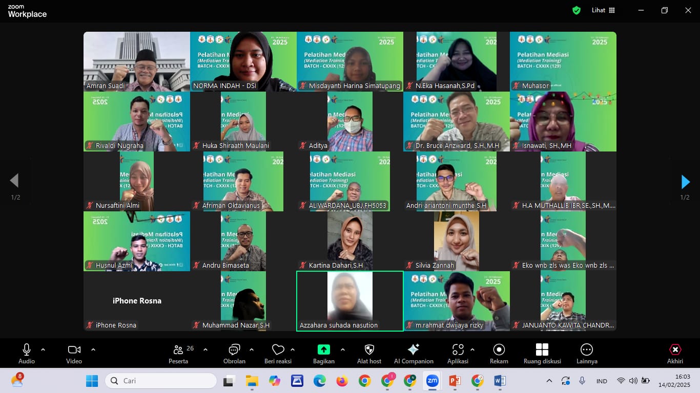 Pada hari Jumat, 14 Februari 2025, Pelatihan Mediasi Batch 129 kembali menyajikan rangkaian kegiatan yang penuh dengan wawasan dan interaksi melalui Zoom. Kegiatan yang berlangsung dari 11 hingga 16 Februari 2025 ini menghadirkan materi-materi yang mendalam untuk memperkuat kompetensi para peserta dalam bidang mediasi.