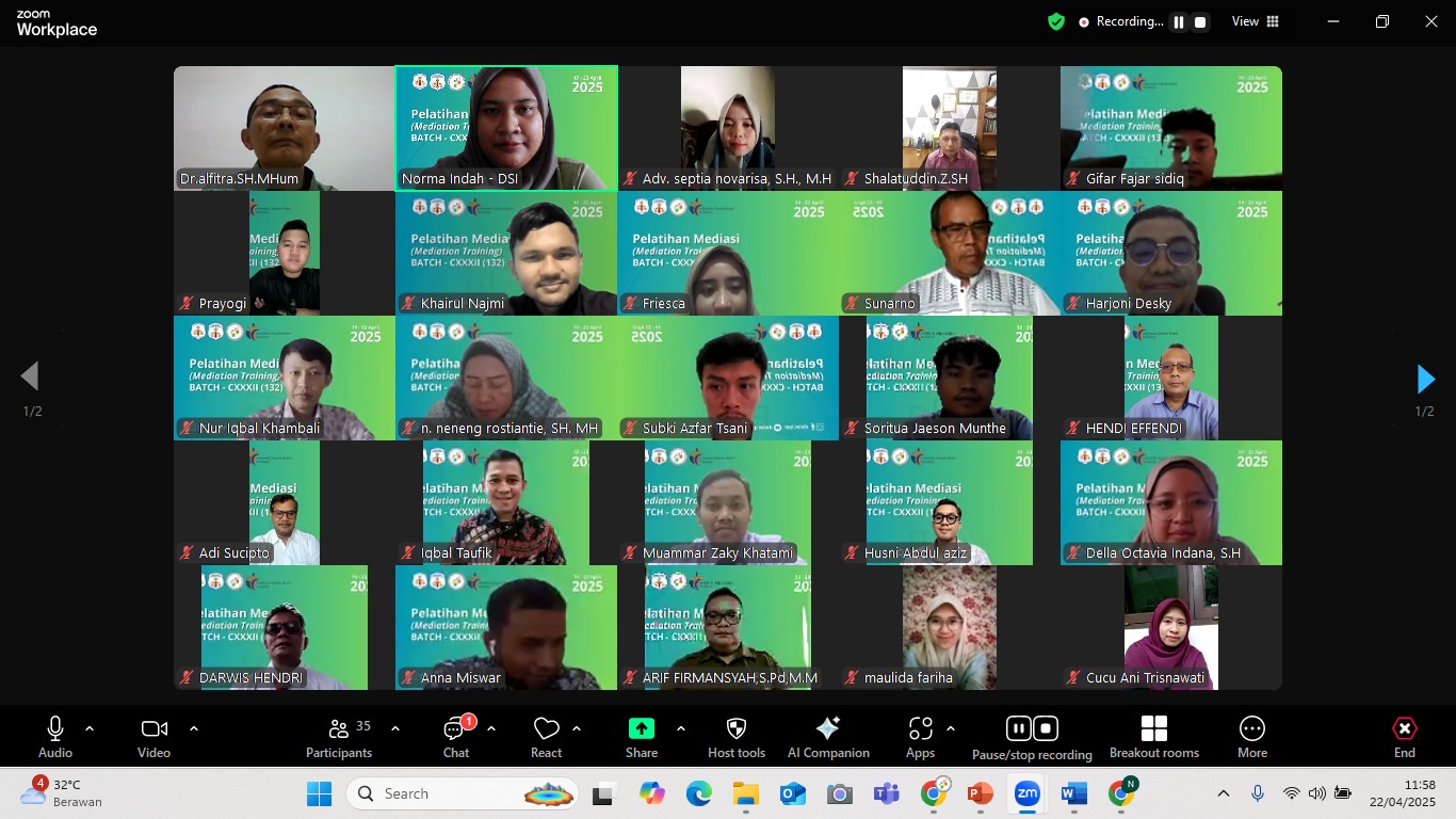 Selasa, 22 April 2025 — Pelatihan Mediasi Batch 132 yang diselenggarakan secara daring melalui platform Zoom sejak tanggal 19 April, memasuki hari keempat dengan antusiasme peserta yang tetap tinggi. Pelatihan ini merupakan hasil kolaborasi antara Institut Pengadaan Publik Indonesia (IPPI), Dewan Sengketa Indonesia (DSI), dan Yayasan Pendidikan Dewan Sengketa Indonesia.