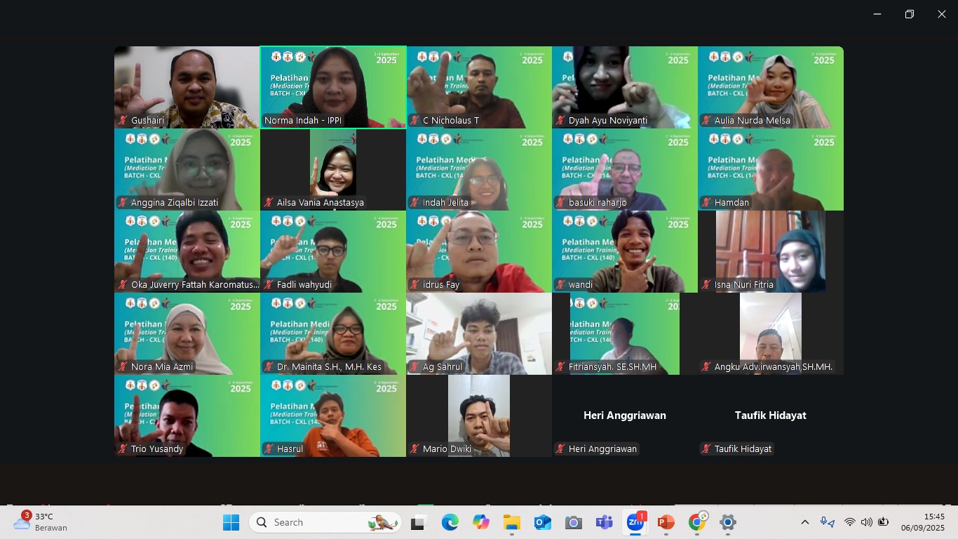 Sabtu, 6 September 2025 menandai berakhirnya rangkaian Pelatihan Mediasi Batch 140 yang telah berlangsung sejak 2 September 2025 secara daring melalui Zoom. Pelatihan ini berhasil menarik antusiasme peserta yang ingin mendalami teknik mediasi sebagai alternatif penyelesaian sengketa yang efektif.