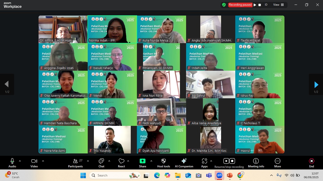 Sabtu, 6 September 2025 menjadi penutup rangkaian Pelatihan Mediasi Batch 140 yang telah berlangsung sejak 2 September 2025 secara daring melalui Zoom. Kegiatan ini diikuti oleh peserta dari berbagai latar belakang dengan tujuan meningkatkan pemahaman dan keterampilan dalam bidang mediasi sebagai alternatif penyelesaian sengketa.