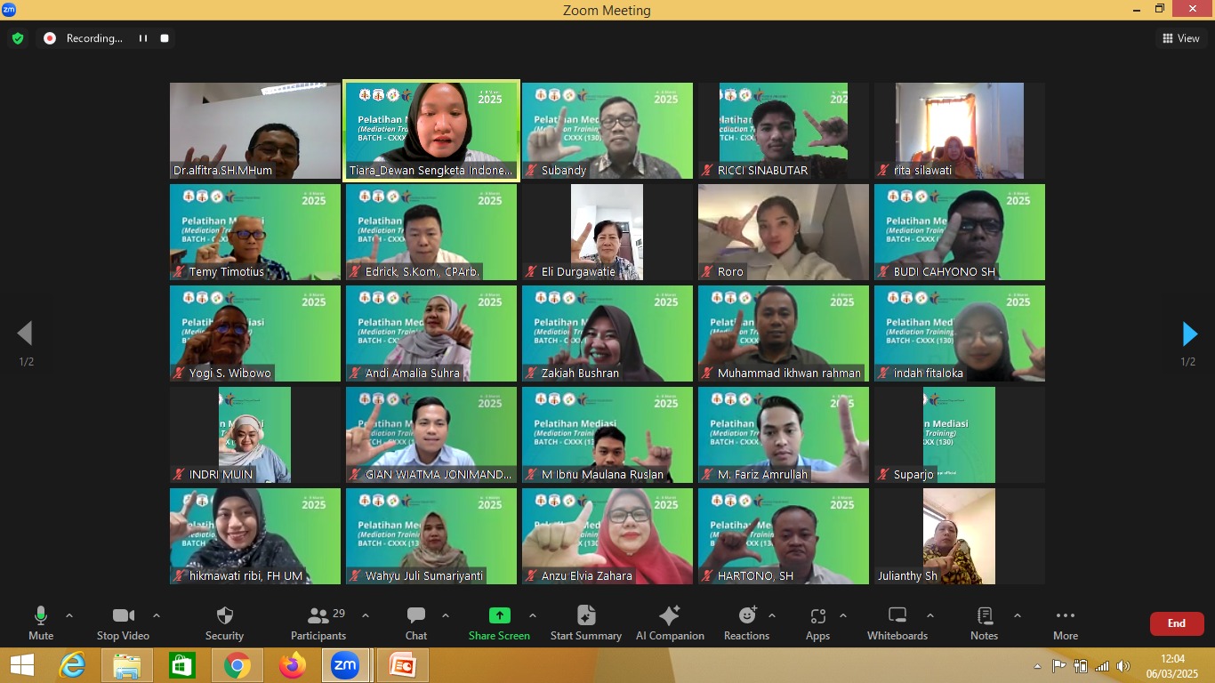 Jakarta – Pelatihan Mediasi Batch 130 yang diselenggarakan secara daring melalui Zoom oleh Institut Pengadaan Publik Indonesia (IPPI), Dewan Sengketa Indonesia (DSI), dan Yayasan Pendidikan Dewan Sengketa Indonesia memasuki hari ketiga pada Kamis, 6 Maret 2025.