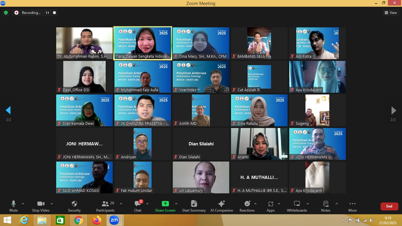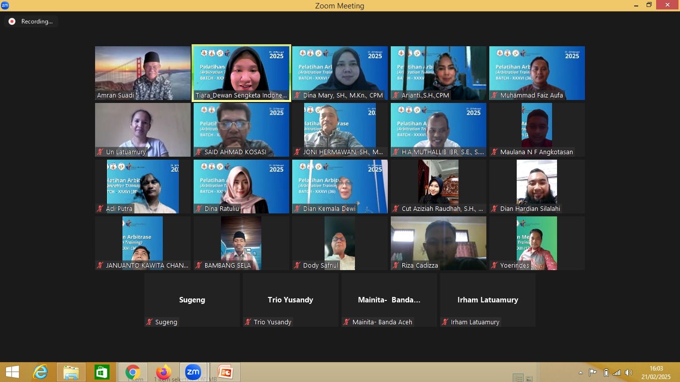 Pelatihan Arbitrase Batch 36 resmi dibuka hari ini melalui platform Zoom, sebagai bagian dari rangkaian kegiatan yang akan berlangsung hingga 23 Februari 2025. Acara yang diselenggarakan secara daring ini dihadiri oleh para praktisi hukum, akademisi, dan pemangku kepentingan di bidang penyelesaian sengketa, dengan tujuan memperdalam pengetahuan dan keterampilan dalam mekanisme arbitrase.