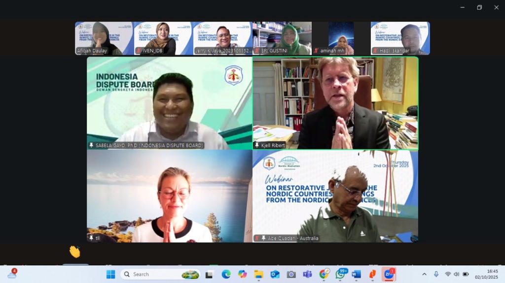 Jakarta – Indonesia Dispute Board (IDB) bekerja sama dengan Institute of Nordic Mediation (INM) sukses menyelenggarakan Webinar on Restorative Justice: Learned from Nordic Experiences pada Kamis, 2 Oktober 2025.