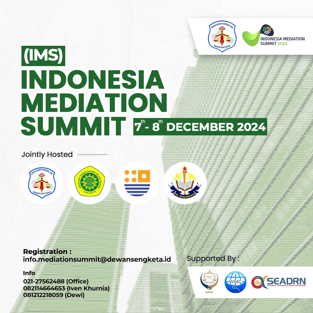 Indonesia Mediation Summit (IMS) 2024 akan diadakan pada tanggal 7 – 8 Desember 2024 di Jakarta. Acara ini bertujuan untuk mengumpulkan para mediator, praktisi hukum, akademisi, dan para profesional di bidang penyelesaian sengketa untuk berbagi pengetahuan, pengalaman, dan solusi inovatif dalam memajukan peran mediasi di Indonesia.