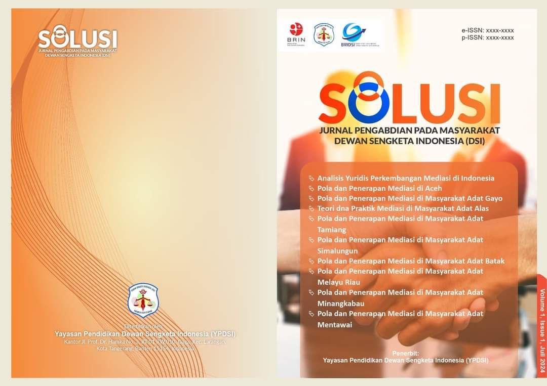 SOLUSI, Jurnal Pengabdian pada Masyarakat yang diterbitkan oleh Yayasan Pendidikan Dewan Sengketa Indonesia (YPDSI), menampilkan berbagai artikel yang membahas pola dan penerapan mediasi dalam masyarakat adat di Indonesia. Edisi pertama ini mencakup analisis yuridis perkembangan mediasi di Indonesia dan penerapannya di berbagai daerah adat, termasuk Aceh, Gayo, Alas, Tamiang, Simalungun, Batak, Melayu Riau, Minangkabau, dan Mentawai. Jurnal ini bertujuan untuk menjadi platform bagi akademisi dan praktisi dalam berbagi pengalaman dan hasil penelitian mengenai mediasi sebagai metode penyelesaian sengketa yang efektif di masyarakat adat.