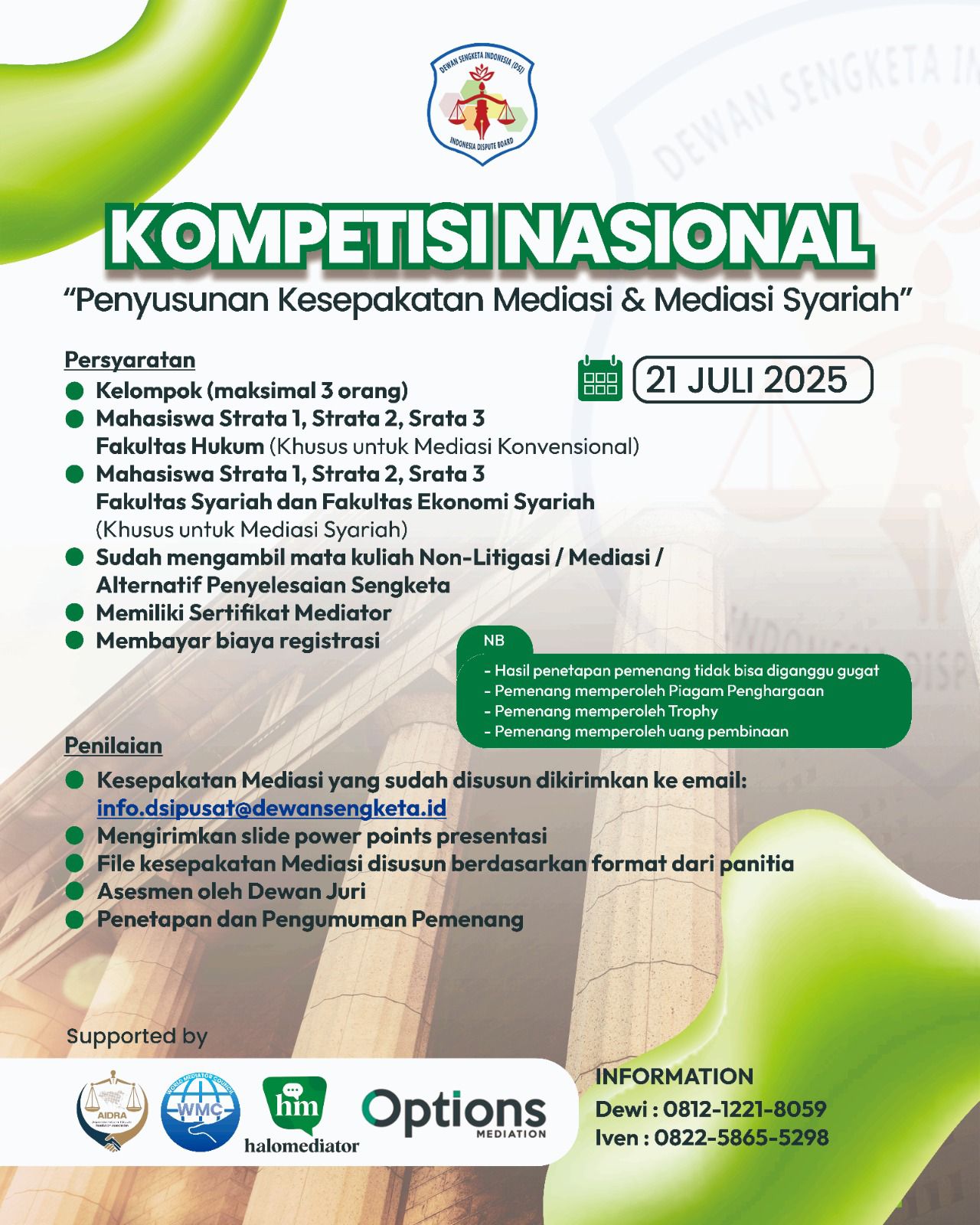 Dewan Sengketa Indonesia (DSI) dengan bangga menggelar Kompetisi Nasional: Penyusunan Kesepakatan Mediasi & Mediasi Syariah, sebuah ajang bergengsi bagi para praktisi dan peminat bidang mediasi untuk mengasah kemampuan, berbagi pengalaman, dan menunjukkan keahlian terbaik mereka dalam penyelesaian sengketa.