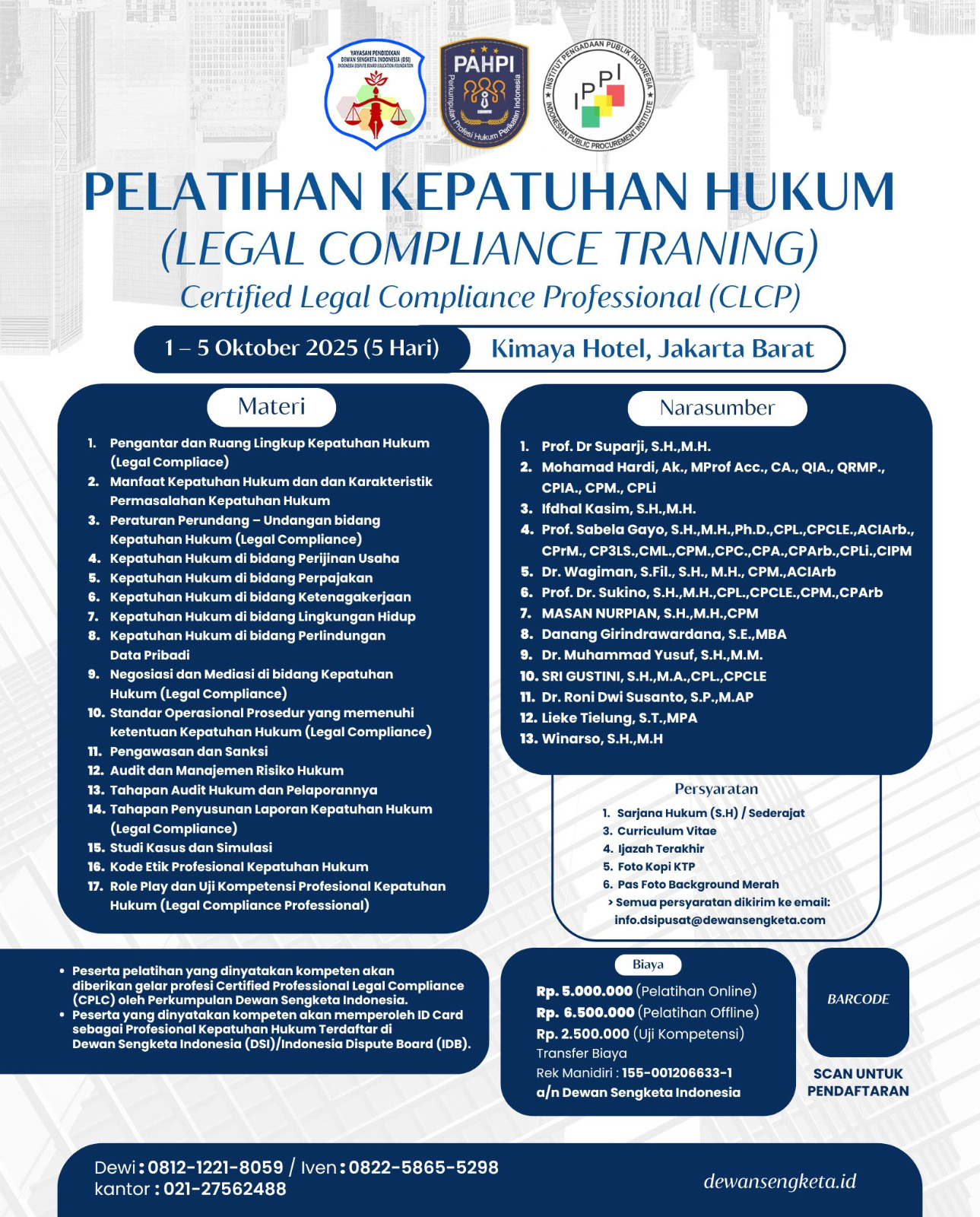 Jakarta Barat — Yayasan Pendidikan Dewan Sengketa Indonesia (YPDSI) bersama mitra akan menyelenggarakan LEGAL COMPLIANCE TRAINING Batch-1 secara offline pada 1–5 Oktober 2025 di Kimaya Hotel, Jakarta Barat.