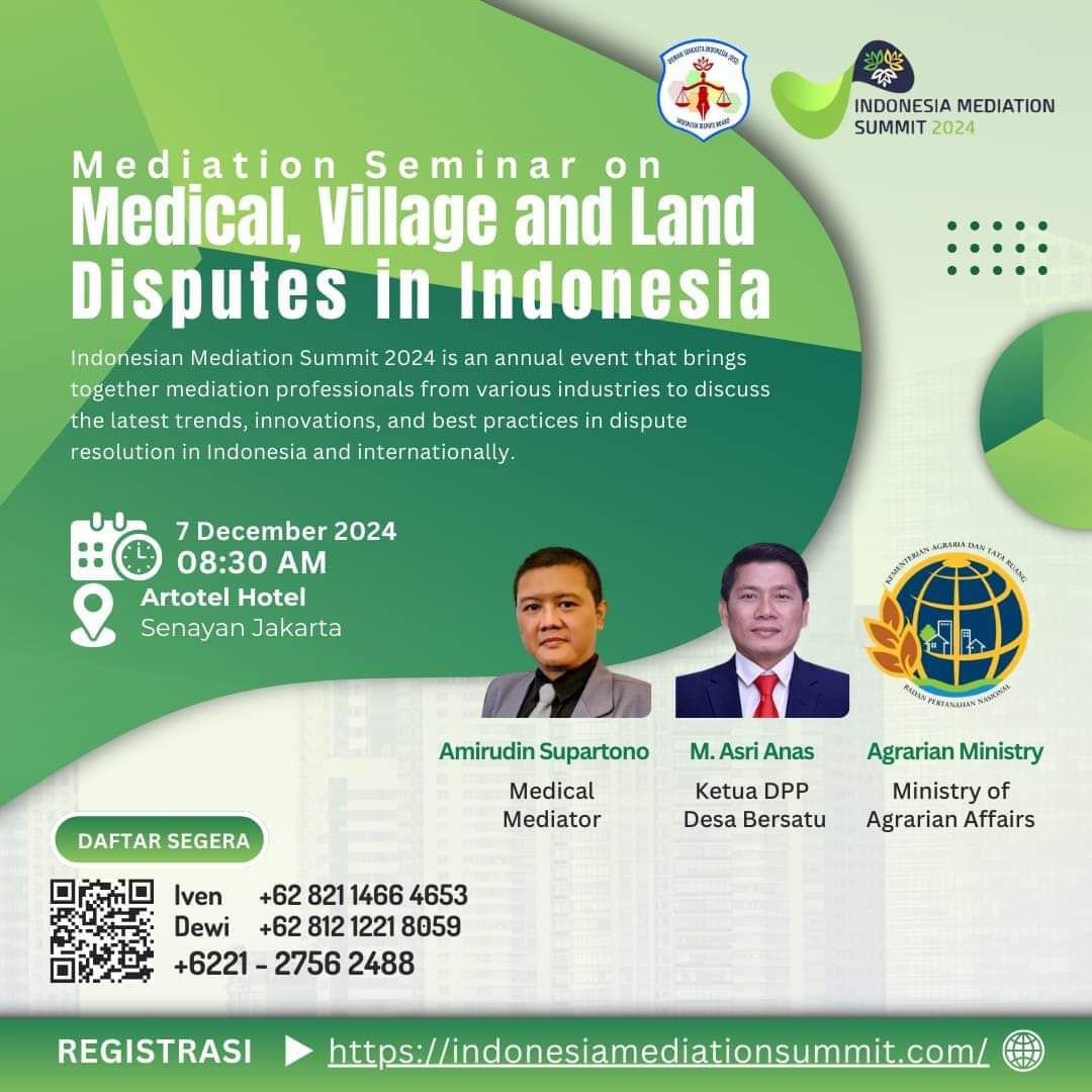 Pada tanggal 7 Desember 2024, konferensi mediasi yang bertajuk Mediation Conference on Medical, Village, and Land Disputes in Indonesia akan digelar di Artotel Hotel, Senayan, Jakarta. Acara ini akan dimulai pukul 08.00 pagi, menghadirkan para ahli di bidang mediasi yang fokus pada isu-isu krusial seperti sengketa medis, perdesaan, dan pertanahan di Indonesia.