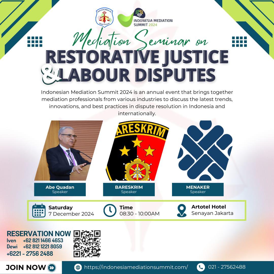 Pada tanggal 7 Desember 2024 mendatang, konferensi bertajuk Mediation Conference on Restorative Justice & Labour Disputes akan digelar di Artotel Hotel, Senayan, Jakarta. Acara ini akan berlangsung dari pukul 08.00 hingga 10.00 pagi, menghadirkan pembicara-pembicara ahli, yaitu Abe Quadan, perwakilan dari Bareskrim, dan Menteri Ketenagakerjaan.