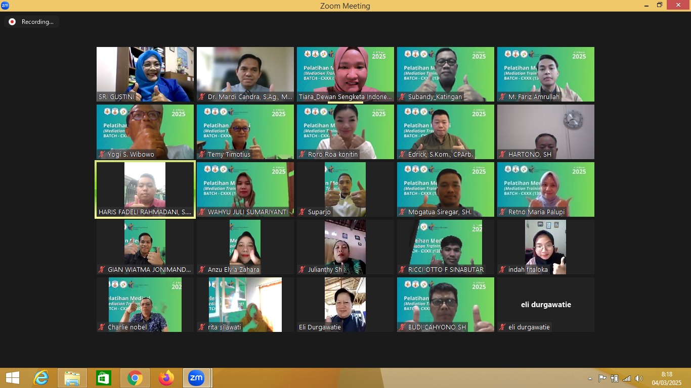 Institut Pengadaan Publik Indonesia (IPPI), Dewan Sengketa Indonesia (DSI), dan Yayasan Pendidikan Dewan Sengketa Indonesia secara resmi membuka Pelatihan Mediasi Batch 130 yang diselenggarakan secara daring melalui platform Zoom. Pelatihan ini berlangsung selama lima hari, mulai dari tanggal 4 hingga 8 Maret 2025, dan bertujuan untuk meningkatkan kompetensi peserta dalam bidang mediasi serta penyelesaian sengketa.