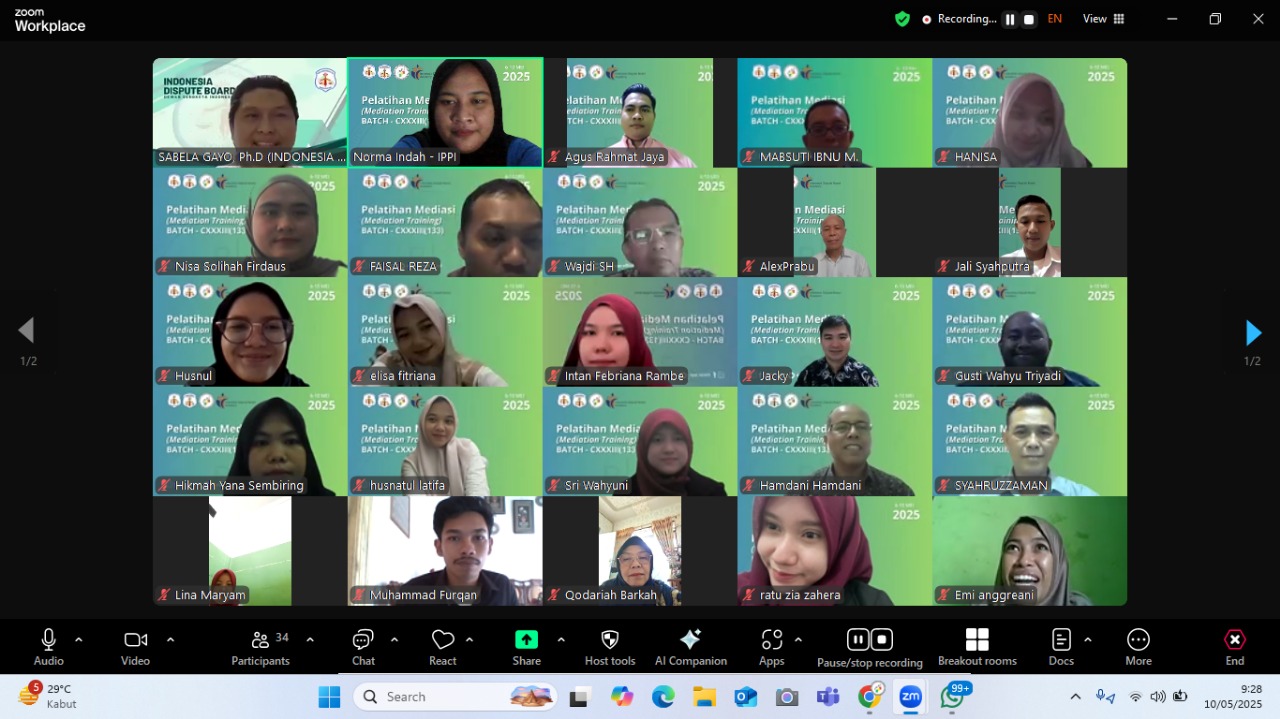 Jakarta, IndonesiaPelatihan Mediasi Batch 133 yang diselenggarakan oleh Institut Pengadaan Publik Indonesia (IPPI), Dewan Sengketa Indonesia (DSI), dan Yayasan Pendidikan Dewan Sengketa Indonesia mencapai hari kelima pada Sabtu, 10 Mei 2025 melalui Zoom. Pelatihan ini berlangsung dari 6 hingga 10 Mei 2025.