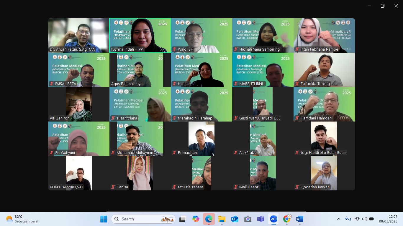Jakarta, IndonesiaPelatihan Mediasi Batch 133 yang diselenggarakan oleh Institut Pengadaan Publik Indonesia (IPPI), Dewan Sengketa Indonesia (DSI), dan Yayasan Pendidikan Dewan Sengketa Indonesia memasuki hari ketiga pada Kamis, 8 Mei 2025 melalui platform Zoom. Pelatihan ini berlangsung dari 6 hingga 10 Mei 2025.