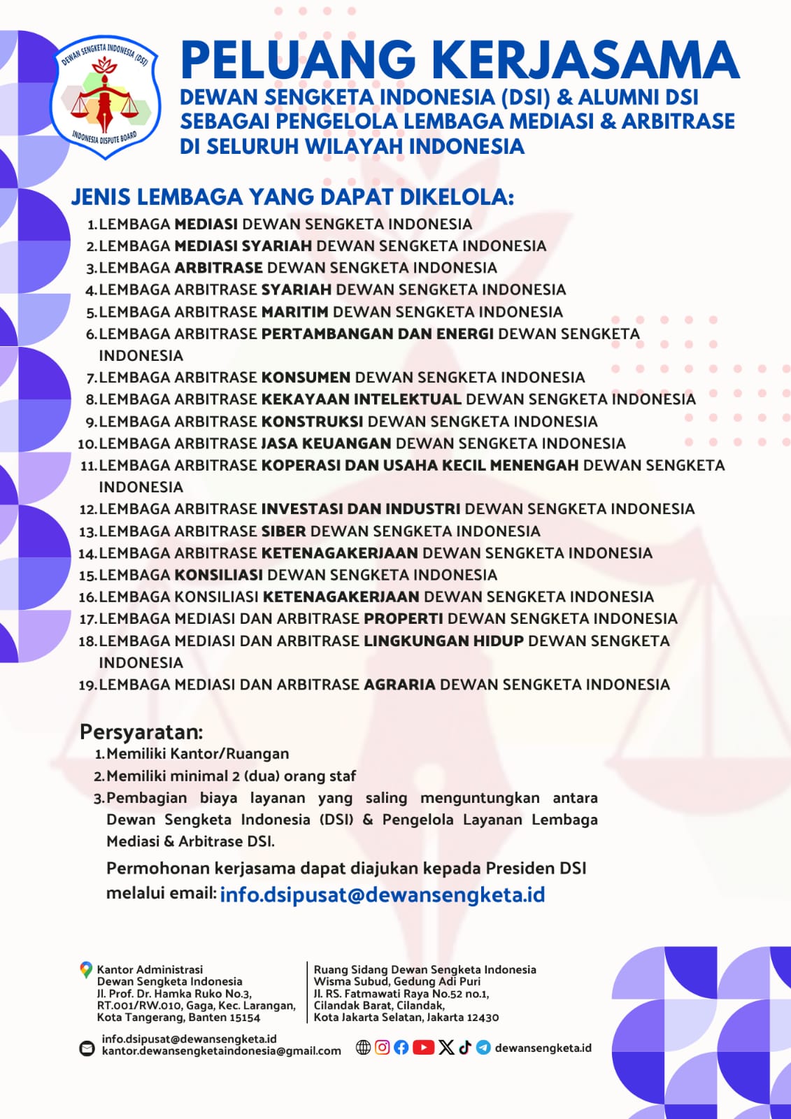 Manfaatkan kesempatan ini untuk menjadi bagian dari solusi penyelesaian sengketa yang inovatif dan berkelanjutan! Untuk informasi lebih lanjut, silakan hubungi DSI melalui kontak resmi yang tersedia.