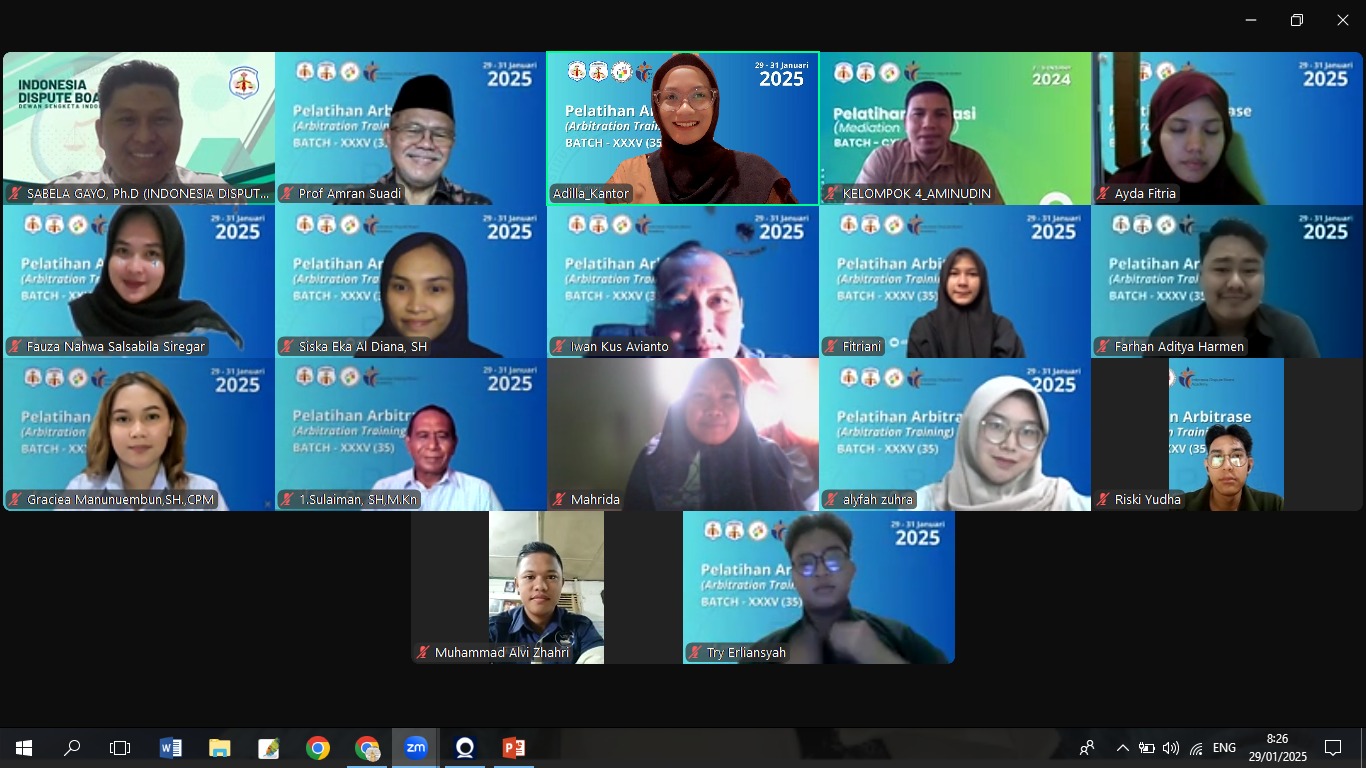 Jakarta, 29 Januari 2025 – Pelatihan Arbitrase Batch 35 resmi dibuka pada Rabu, 29 Januari 2025. Kegiatan yang diselenggarakan secara daring melalui platform Zoom ini akan berlangsung hingga 31 Januari 2025.