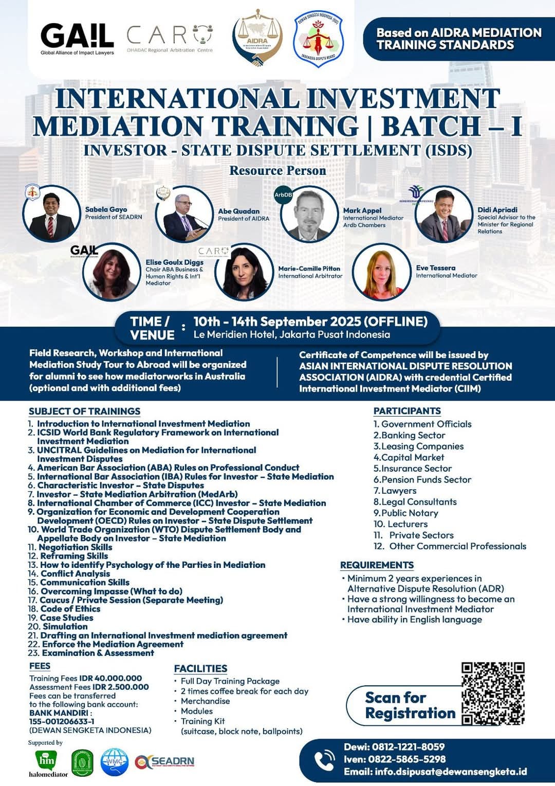 Jakarta, 9 Juni 2025 – Meningkatnya jumlah sengketa investasi antara pemerintah dan masyarakat, antara korporasi dan pemerintah, serta antara korporasi dan komunitas lokal mendorong perlunya pendekatan penyelesaian sengketa yang lebih konstruktif dan berkelanjutan. Menjawab kebutuhan tersebut, International Investment Mediation Training – Batch I (Investor-State Dispute Settlement / ISDS) akan diselenggarakan secara offline pada 10–14 September 2025 di Le Meridien Hotel, Jakarta Pusat.