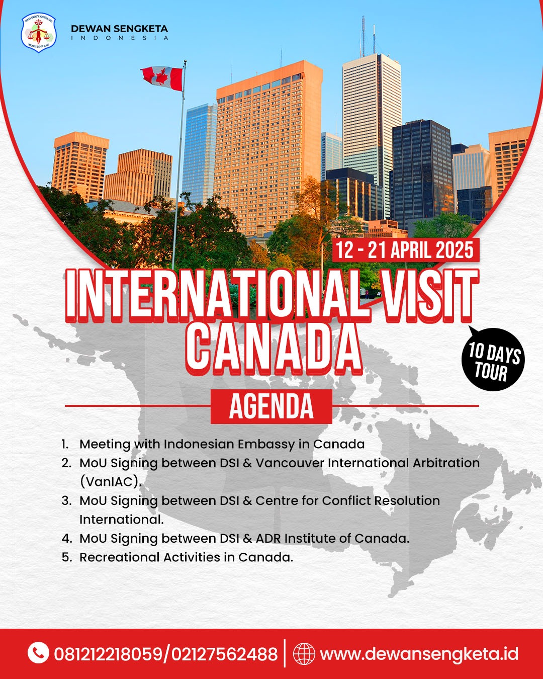 DSI (Dewan Sengketa Indonesia) akan mengadakan kunjungan internasional yang sangat dinantikan ke Kanada pada 12 – 22 April 2025 selama 10 hari penuh. Kunjungan ini bertujuan untuk memperkuat hubungan internasional serta menjalin kerjasama dengan berbagai institusi terkemuka di bidang arbitrase dan resolusi sengketa di Kanada.