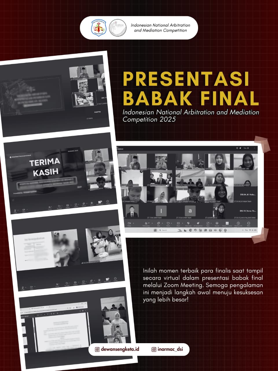 Presentasi babak final ini menjadi momen penting bagi peserta untuk menunjukkan kualitas, kerja sama tim, dan profesionalitas dalam bidang arbitrase maupun mediasi. Meski digelar secara daring, antusiasme dan dedikasi para finalis tetap terasa kuat, membuktikan bahwa semangat berkompetisi tidak terhalang oleh jarak.