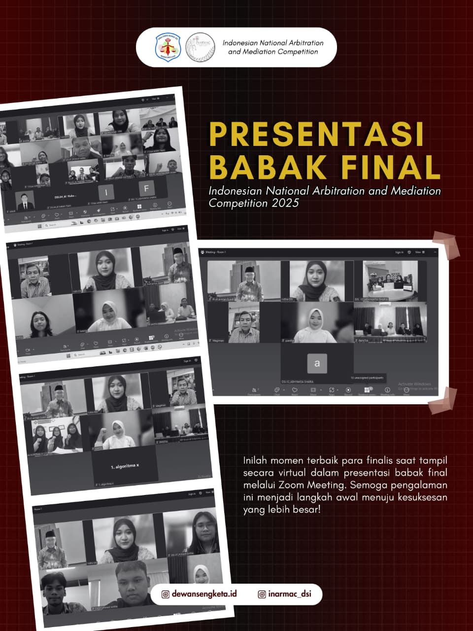 Ajang Indonesian National Arbitration and Mediation Competition (INARMAC) 2025 telah memasuki babak final yang penuh semangat dan antusiasme. Para finalis dari berbagai perguruan tinggi di Indonesia tampil secara virtual melalui Zoom Meeting, menampilkan kemampuan terbaik mereka dalam menyajikan argumentasi, strategi penyelesaian sengketa, serta keterampilan komunikasi hukum.