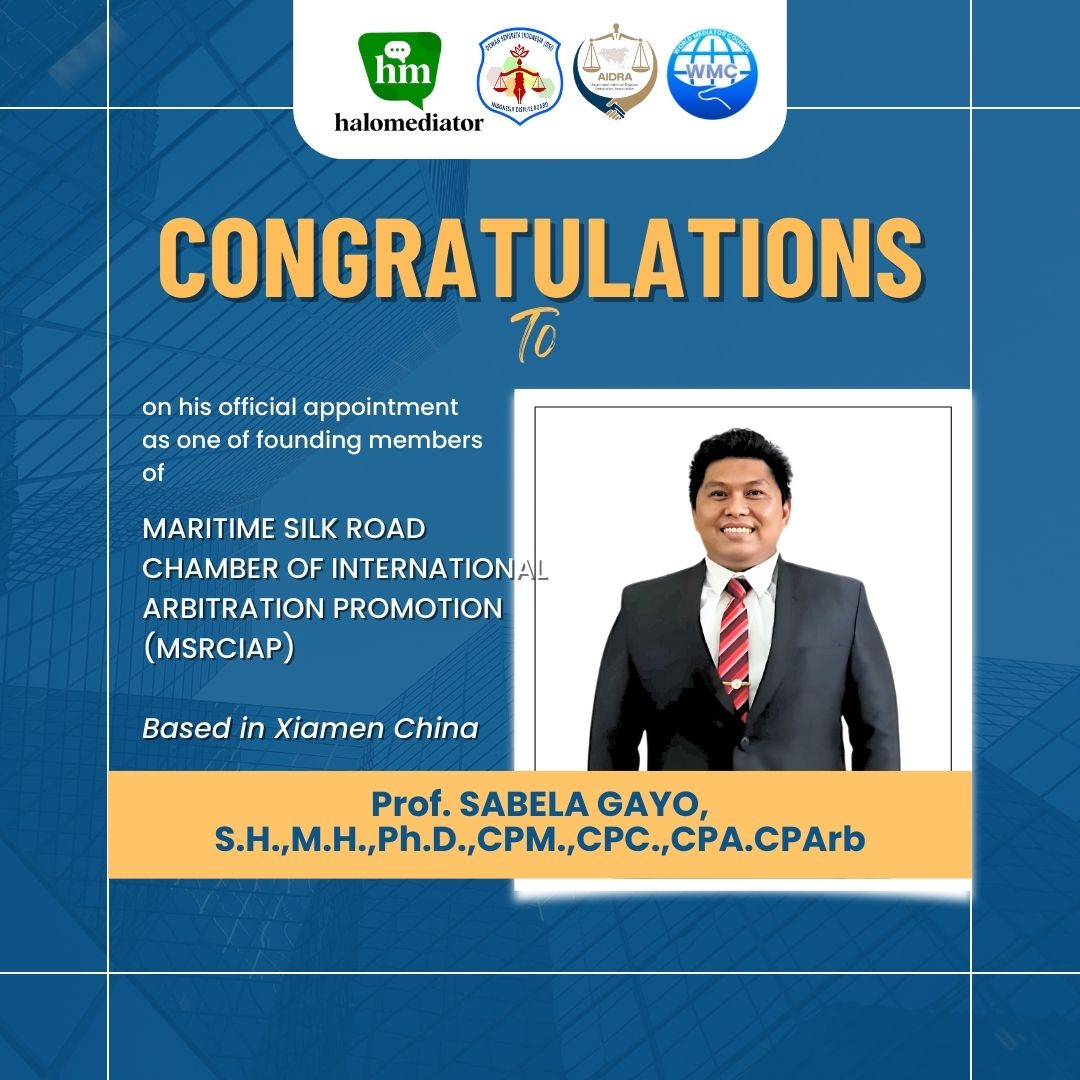Xiamen, China — Kabar membanggakan datang dari dunia arbitrase internasional. Prof. Sabela Gayo , S.H., M.H., Ph.D., CPM., CPC., CPA., CPArb secara resmi ditunjuk sebagai salah satu anggota pendiri Maritime Silk Road Chamber of International Arbitration Promotion (MSRCIAP), sebuah lembaga promosi arbitrase internasional yang berbasis di Xiamen, Tiongkok.
