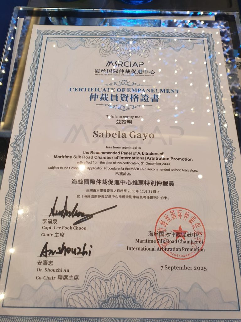 Pada tanggal 7 September 2025, Prof. Sabela menerima sertifikat resmi empanelment yang menandai pengakuannya sebagai salah satu arbitrator internasional dalam lingkup MRSCIAP. Empanelment ini tidak hanya mencerminkan rekognisi atas kapasitas akademis dan profesional beliau, tetapi juga menjadi simbol keterlibatan aktif Indonesia dalam jaringan arbitrase global.