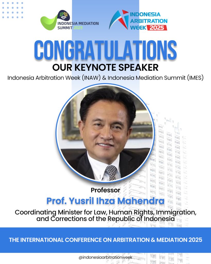 Denpasar, Bali – Dewan Sengketa Indonesia bersama mitra internasional resmi mengumumkan kehadiran Prof. Yusril Ihza Mahendra, S.H., M.H., Menteri Koordinator Hukum, Hak Asasi Manusia, Imigrasi, dan Pemasyarakatan Republik Indonesia, sebagai Keynote Speaker sekaligus akan membuka secara resmi rangkaian Indonesia Arbitration Week (INAW) 2025 dan Indonesia Mediation Summit (IMES) 2025.