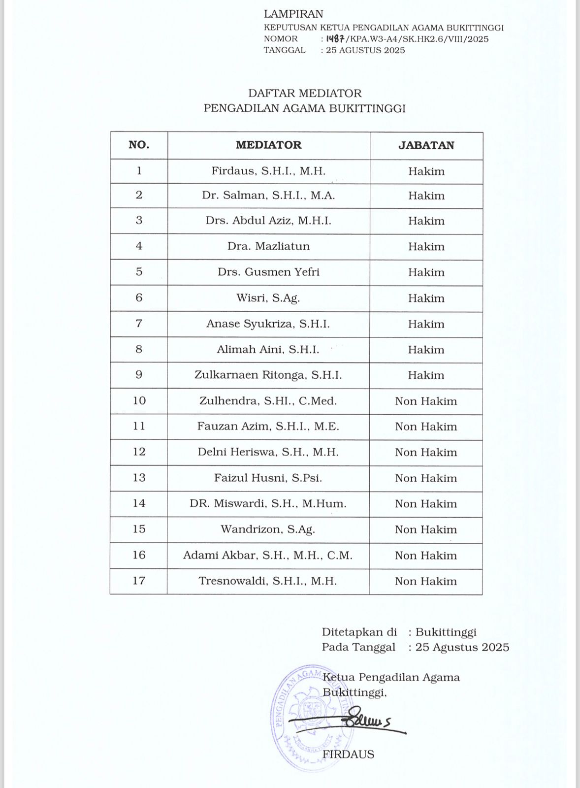 Penetapan ini tertuang dalam Keputusan Ketua Pengadilan Agama Bukittinggi Nomor: W3-A4/SK.HK2.6/VIII/2025 tanggal 25 Agustus 2025, yang menetapkan daftar mediator pada Pengadilan Agama Bukittinggi.