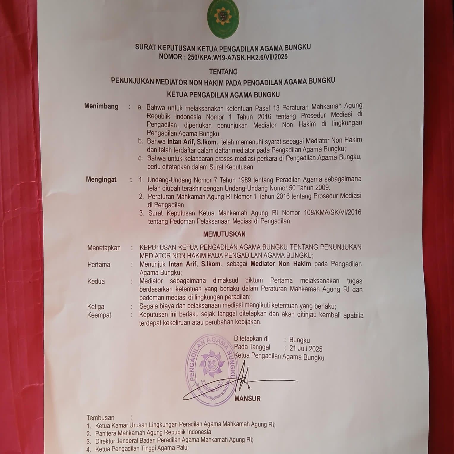 Morowali, Sulawesi Tengah – Kabar membanggakan datang dari alumni IPPI/DSI. INTAN ARIF, S.I.Kom., CPM, resmi diterima sebagai Mediator Non Hakim di Pengadilan Agama Bungku, Kabupaten Morowali, Sulawesi Tengah untuk tahun 2025.