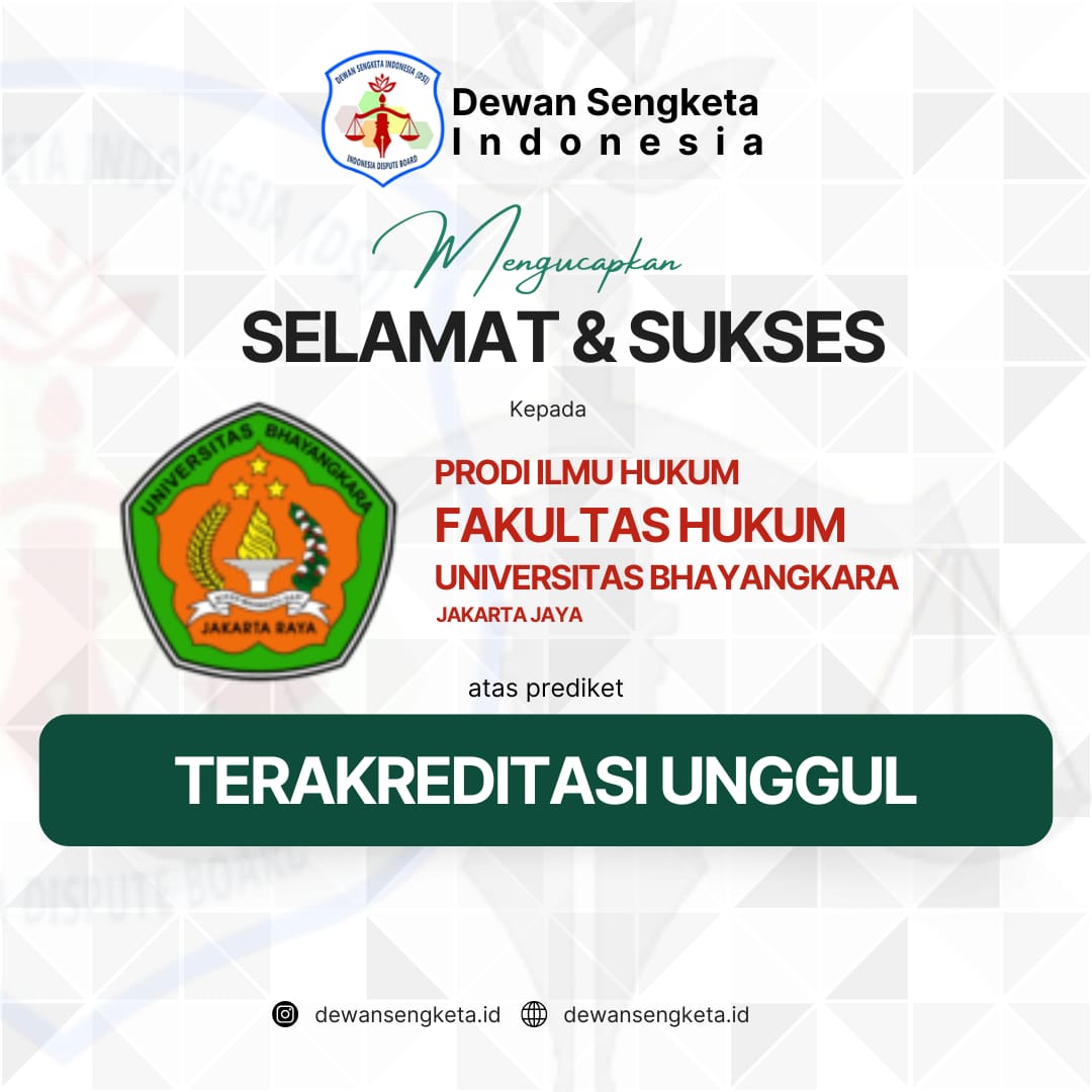 Dewan Sengketa Indonesia (DSI) dengan bangga mengucapkan selamat dan sukses kepada Prodi Ilmu Hukum – Fakultas Hukum Universitas Bhayangkara Jakarta Raya yang baru saja meraih predikat Terakreditasi Unggul.