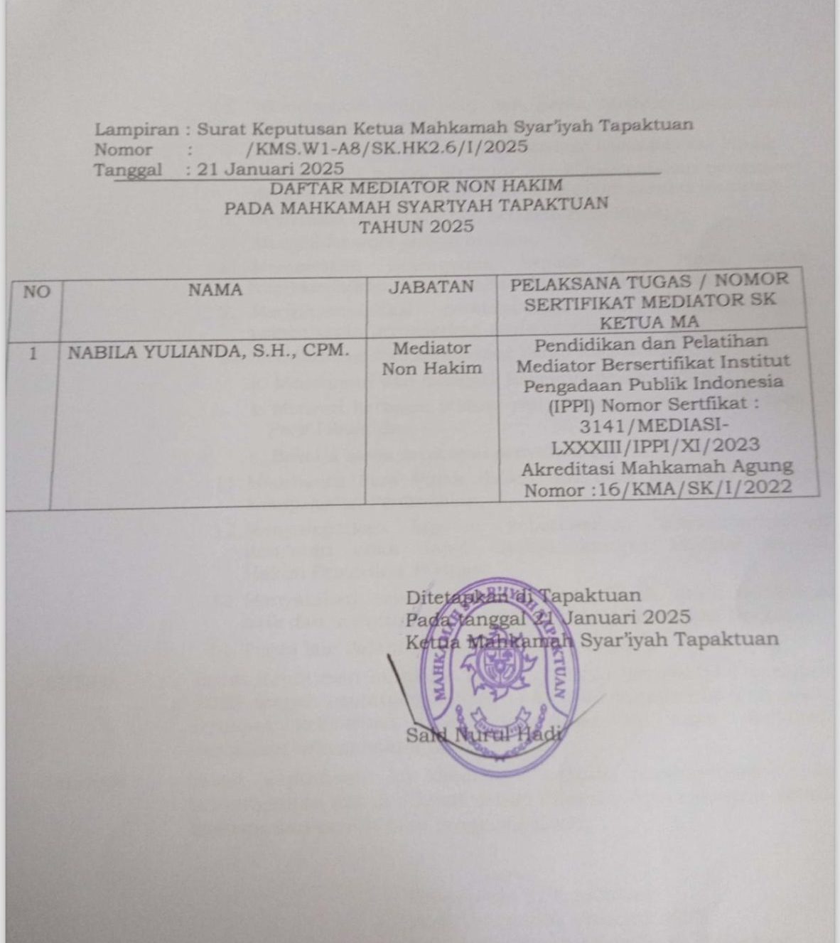 Tapaktuan, Aceh Selatan – Alumni IPPI/DSI, Nabila Yulianda, S.H., CPM., berhasil diterima sebagai Mediator Non Hakim di Mahkamah Syari’yah Tapaktuan, Kabupaten Aceh Selatan, pada tahun 2025. Pencapaian ini menjadi bukti dedikasi dan komitmen Nabila dalam bidang hukum, khususnya dalam menyelesaikan sengketa melalui jalur mediasi.